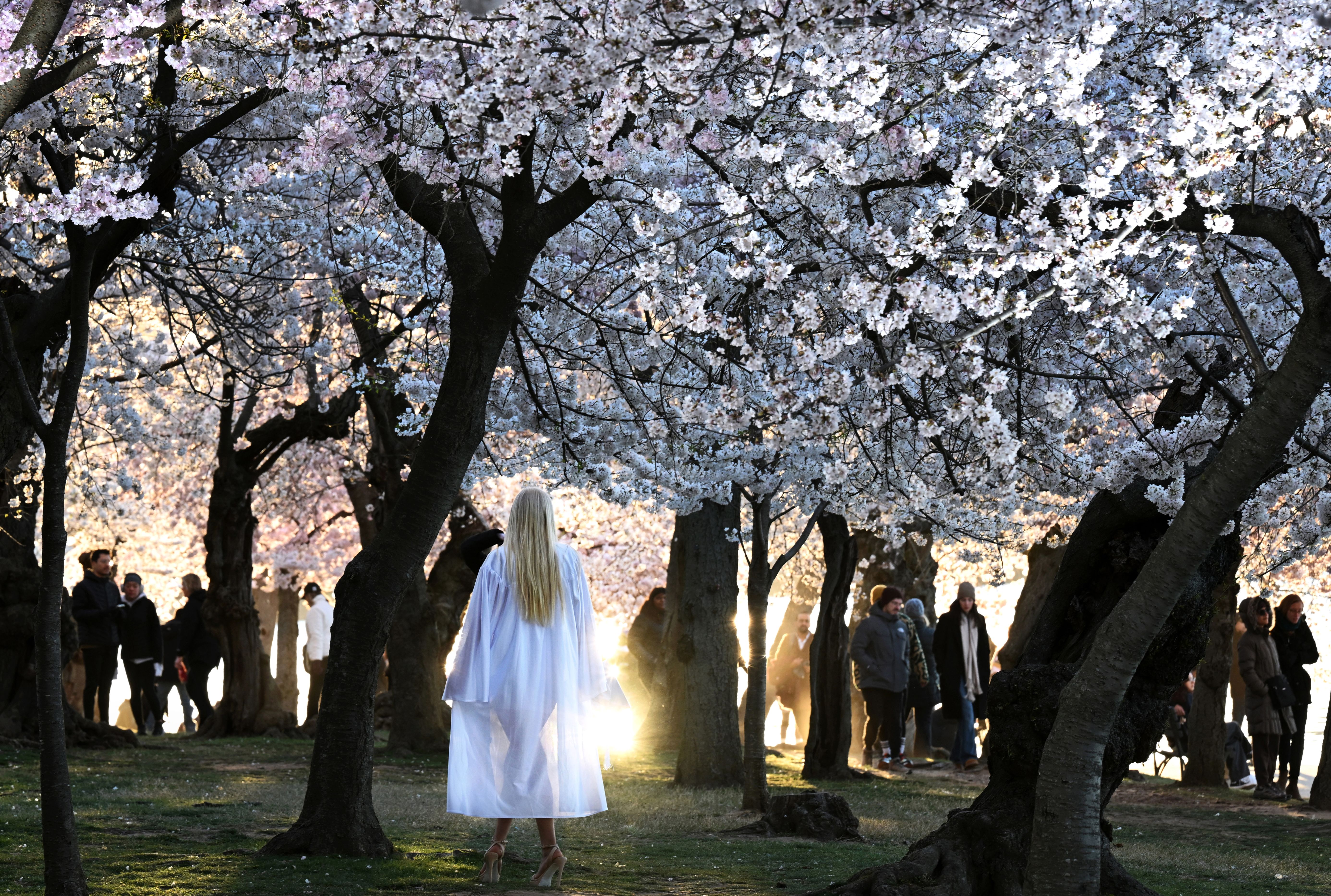 A woman in a white graduation gown poses under a canopy of blooming cherry blossoms near the Tidal Basin on Thursday March 21, 2024 in Washington, DC. (Photo by Matt McClain/The Washington Post)