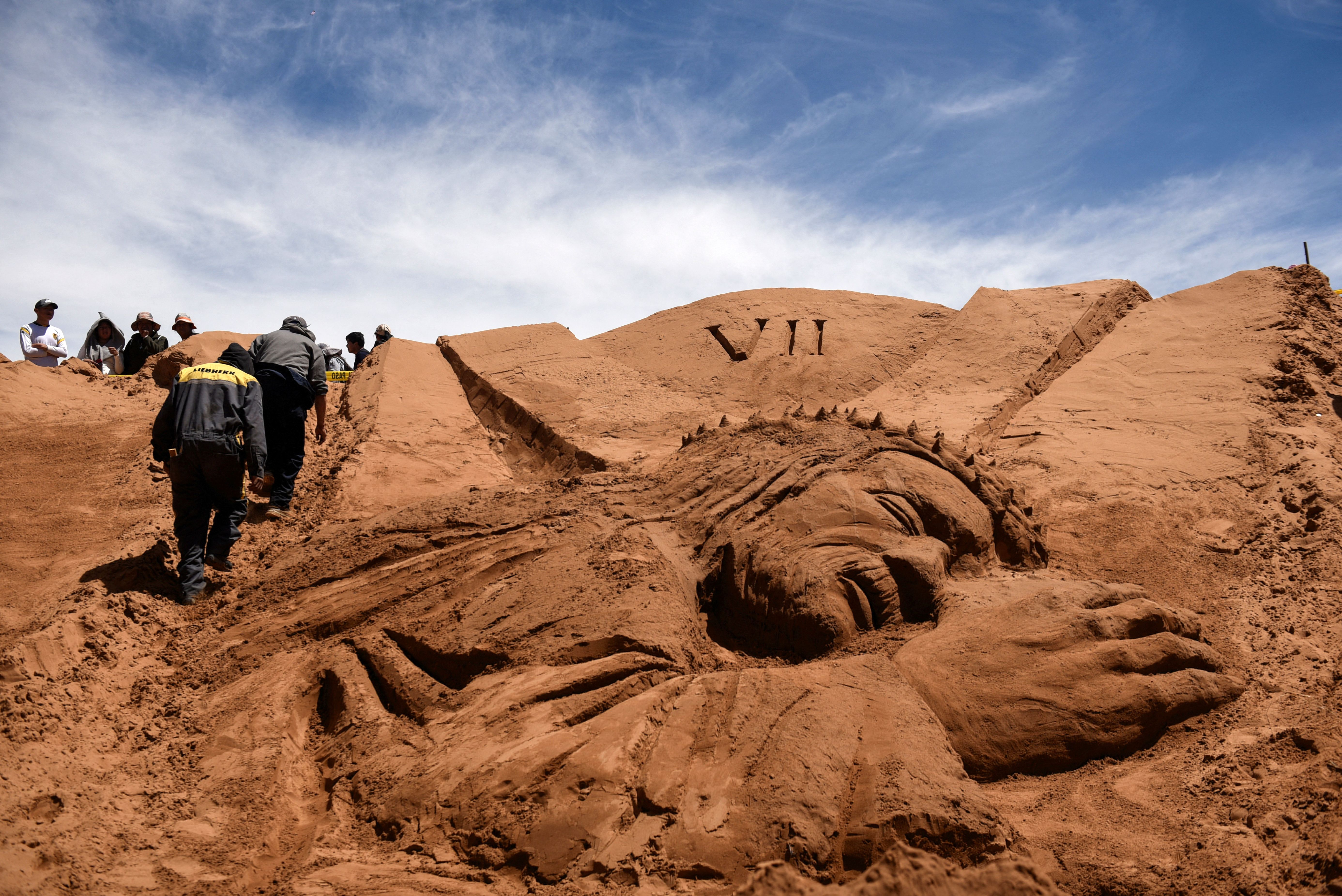 Plastic artists walk near a sand sculpture representing biblical passages during Holy Week celebrations in the Arenal de Cochiraya, on the outskirts of Oruro, Bolivia on March 29, 2024. (Photo by Claudia Morales/Reuters)