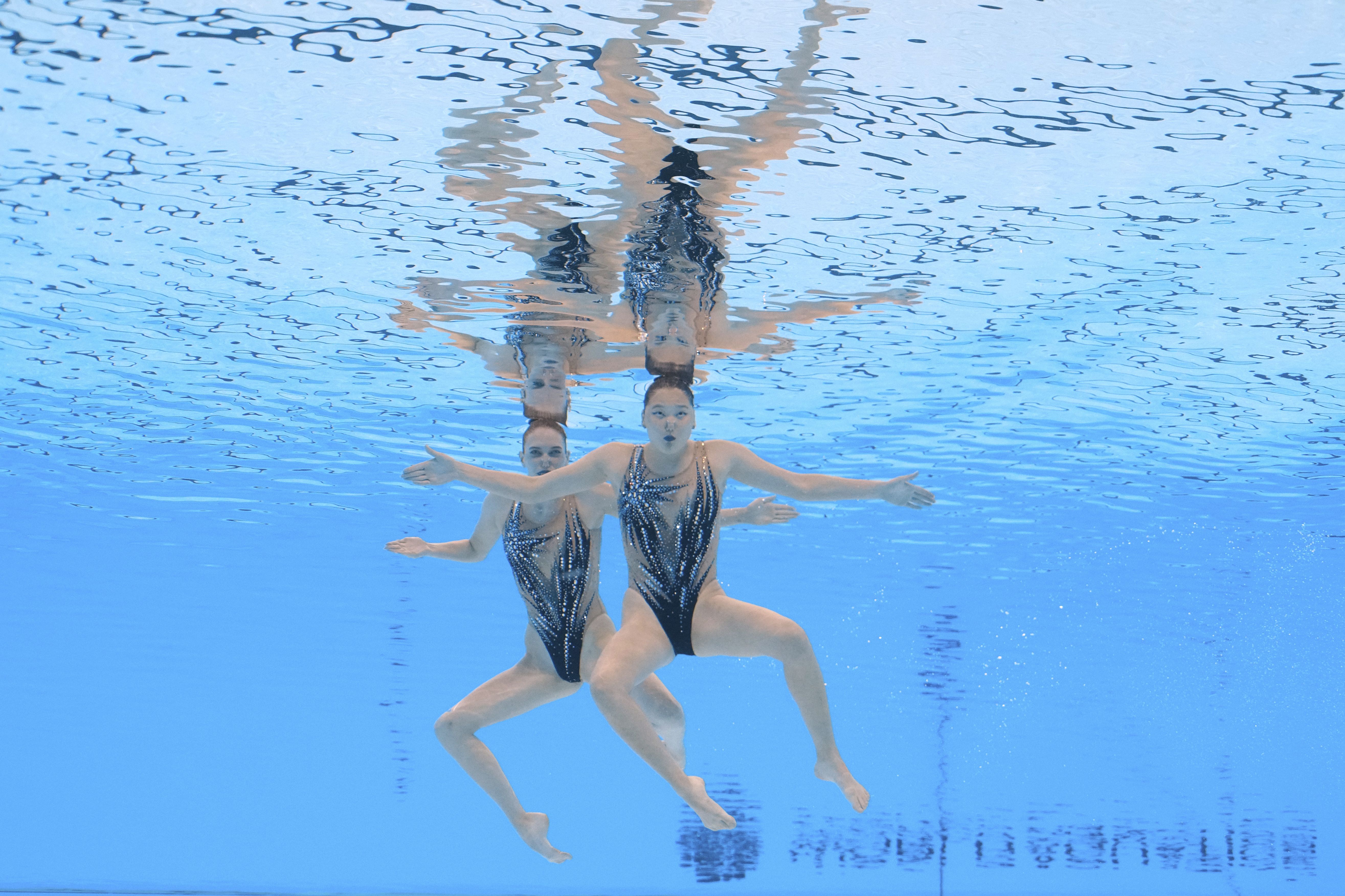 Arina Pushkina and Yasmin Tuyakova of Kazakhstan compete in the women's duet technical preliminary of artistic swimming at the World Aquatics Championships in Singapore, Friday, July 18, 2025. (Photo by Lee Jin-man/AP Photo)