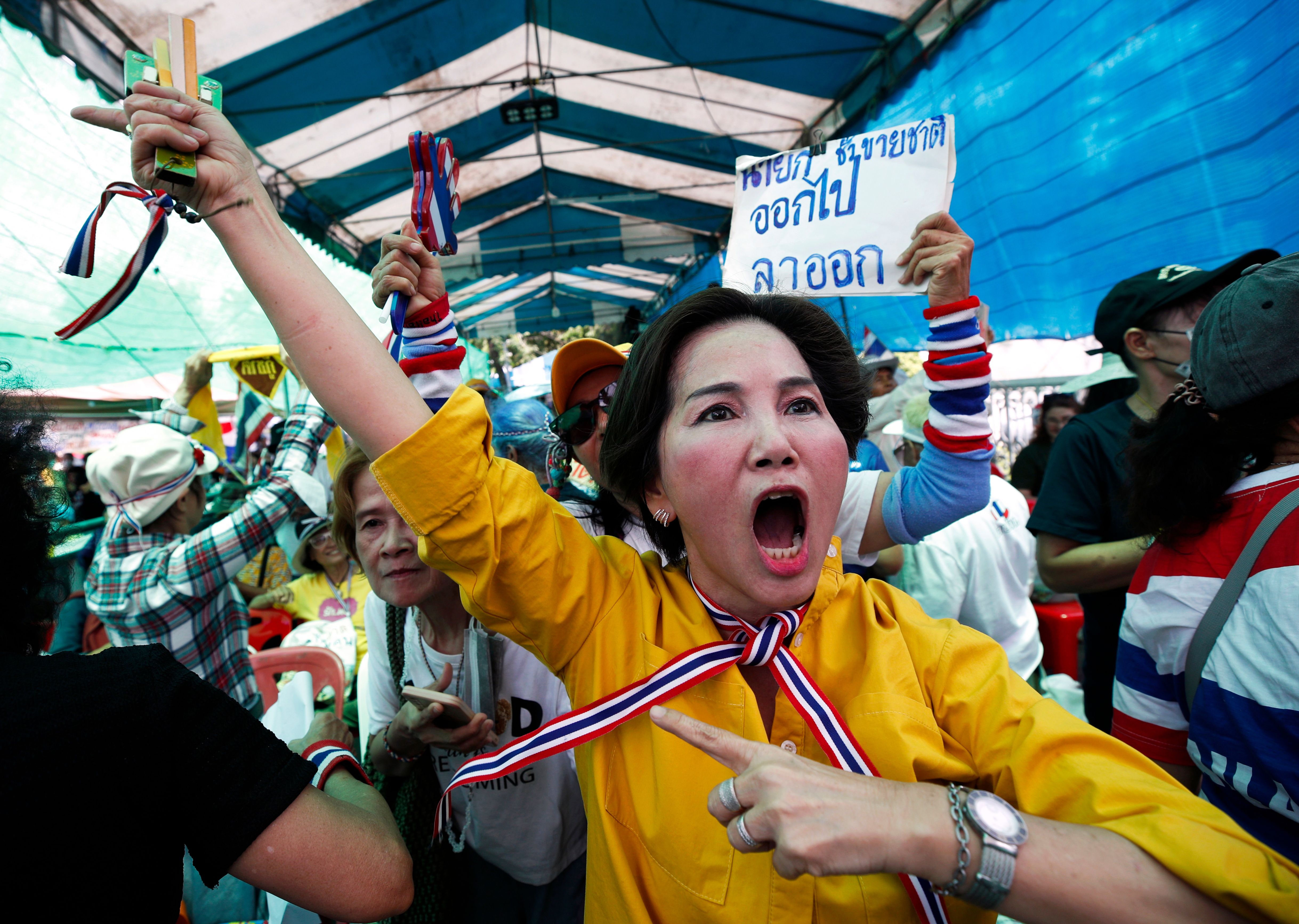Protesters shout slogans during a rally calling for the resignation of the Thai prime minister near the Government House in Bangkok, Thailand, 19 June 2025. A group of anti-Shinawatra protesters held a rally to call for the resignation of the prime minister following the leaked audio of her phone call with former Cambodian premier Hun Sen regarding the countries' border dispute. (Photo by Rungroj Yongrit/EPA/EFE)