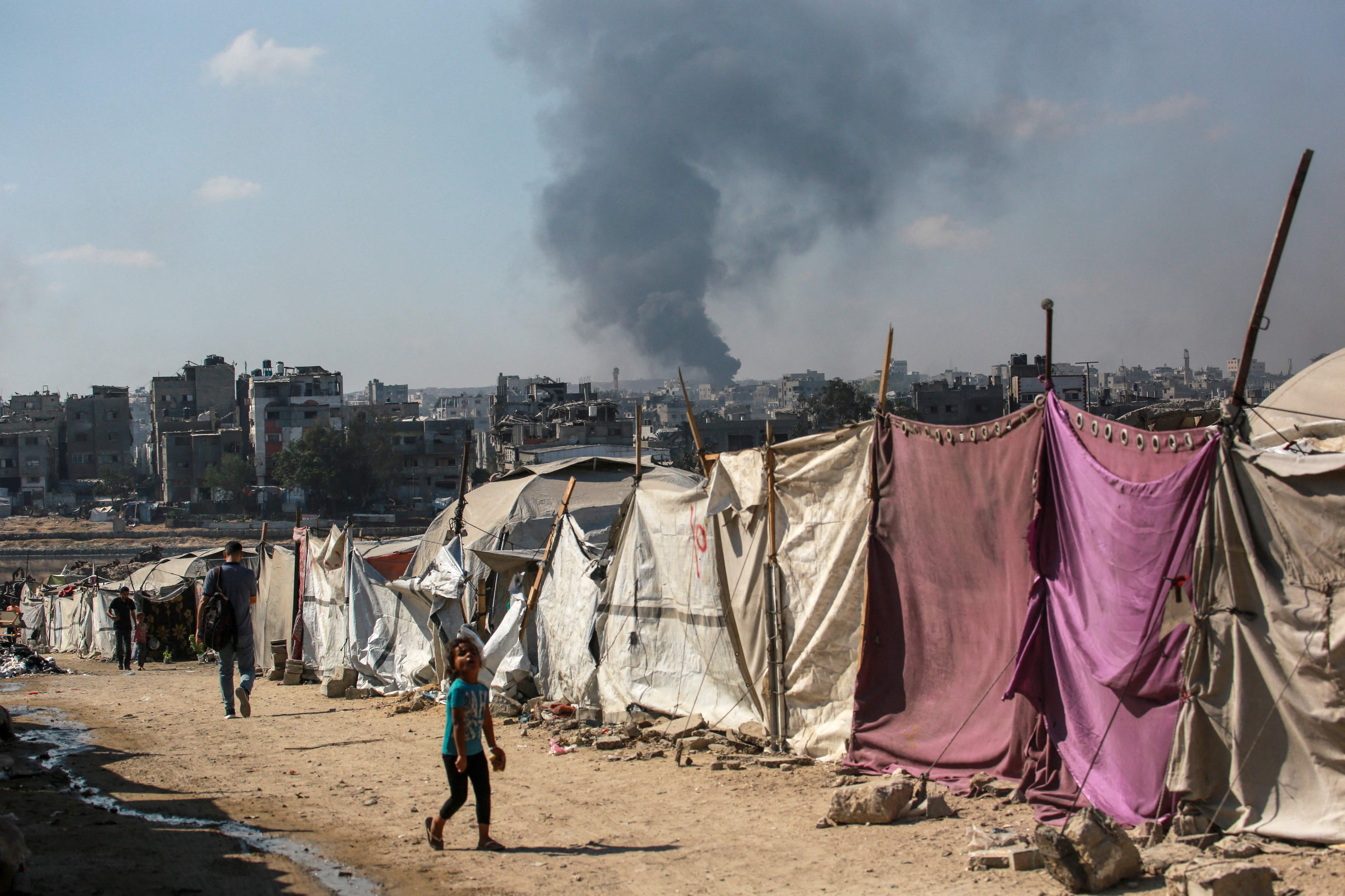 People walk past makesfift shelters as smoke billows east of Gaza City, in the central Gaza Strip during Israeli bombardment on July 6, 2025. An Israeli delegation was expected in Doha on July 6 for talks on a Gaza truce and hostage release deal, after Palestinian group Hamas said it was ready to start negotiations "immediately". (Photo by Bashar Taleb/AFP Photo)