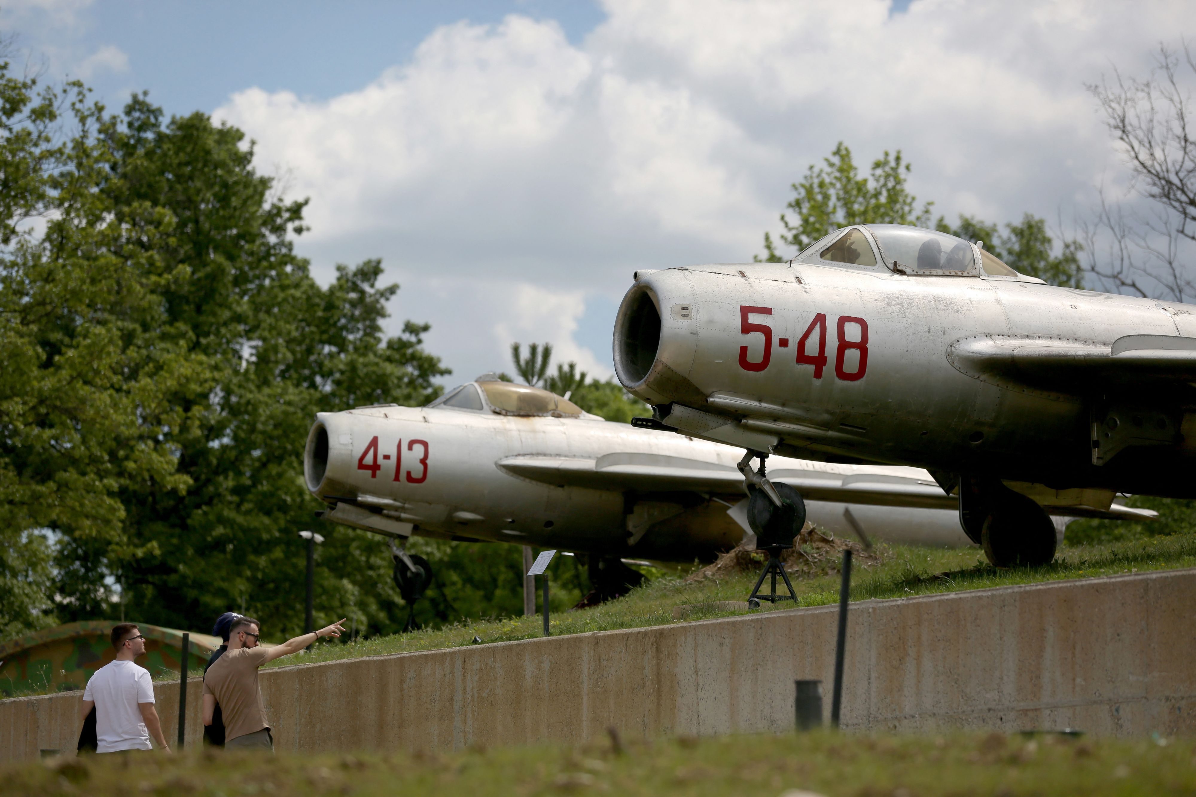 Visitors watch at the Russian and Chinese made military planes in the front yard of the Albanian army museum in Berzhite, near the capital of Tirana, on April 20, 2024. The Albanian army museum in Berzhite, near the capital Tirana, showcases everything from Soviet tanks and Chinese torpedo launchers to home-made weapons and NATO flags. (Photo by Adnan Beci/AFP Photo)