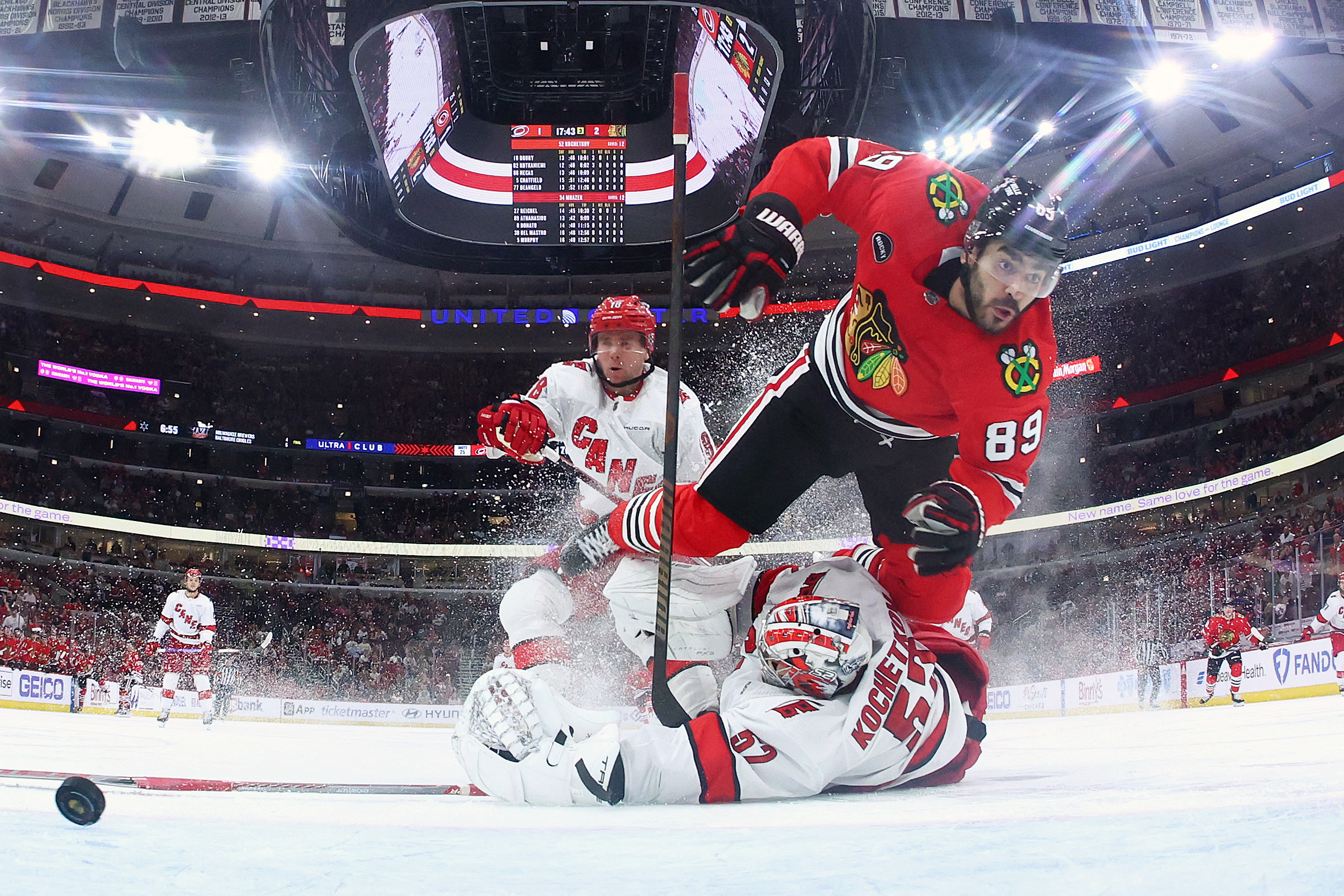Andreas Athanasiou #89 of the Chicago Blackhawks is tripped by Pyotr Kochetkov #52 of the Carolina Hurricanes during the third period at the United Center on April 14, 2024 in Chicago, Illinois. (Photo by Michael Reaves/Getty Images/AFP Photo)