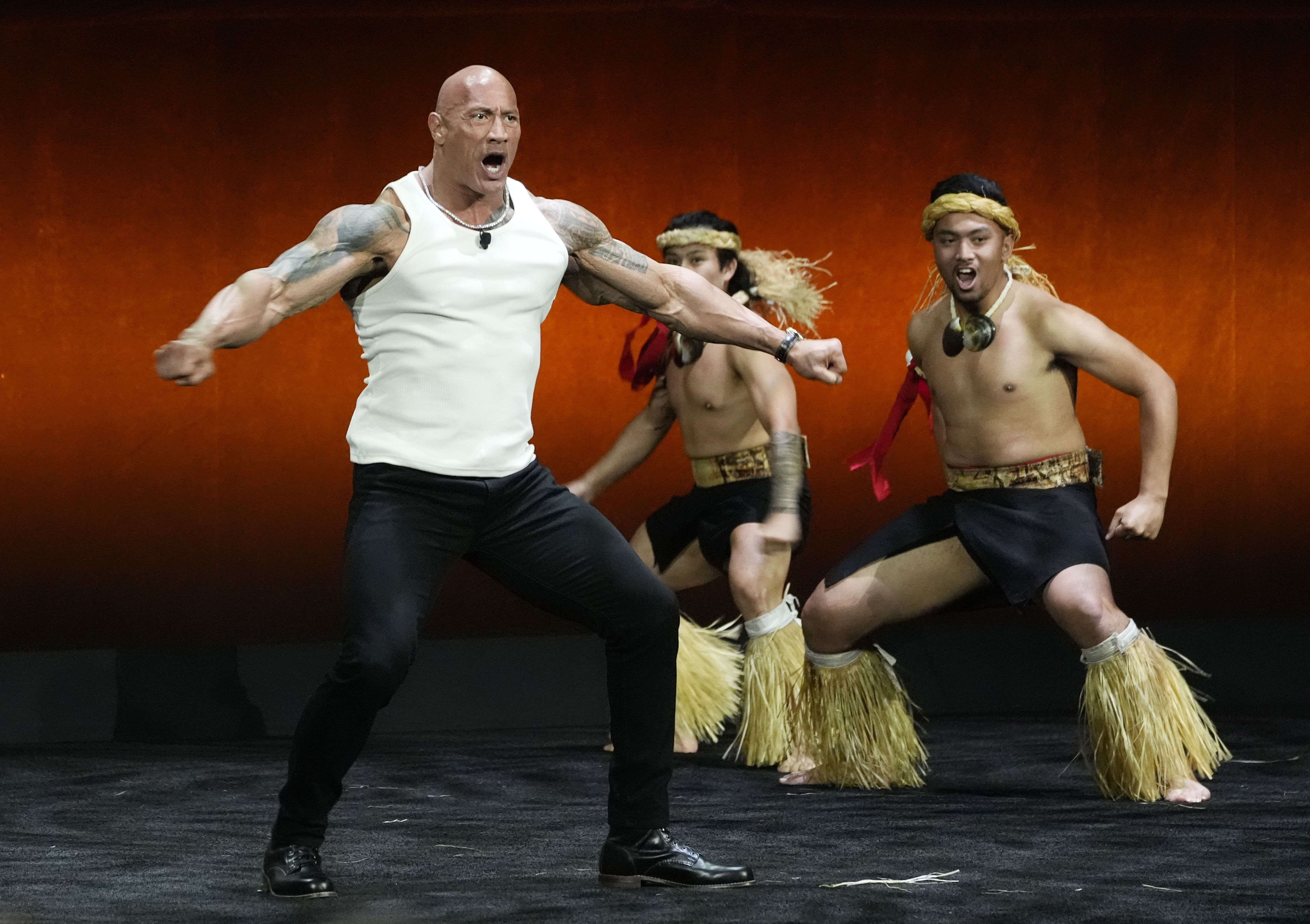 American actor Dwayne “The Rock” Johnson dances onstage before introducing a clip from the upcoming animated film “Moana 2” during the Walt Disney Studios presentation at CinemaCon 2024, at Caesars Palace in Las Vegas, April 11, 2024. (Photo by Chris Pizzello/AP Photo)