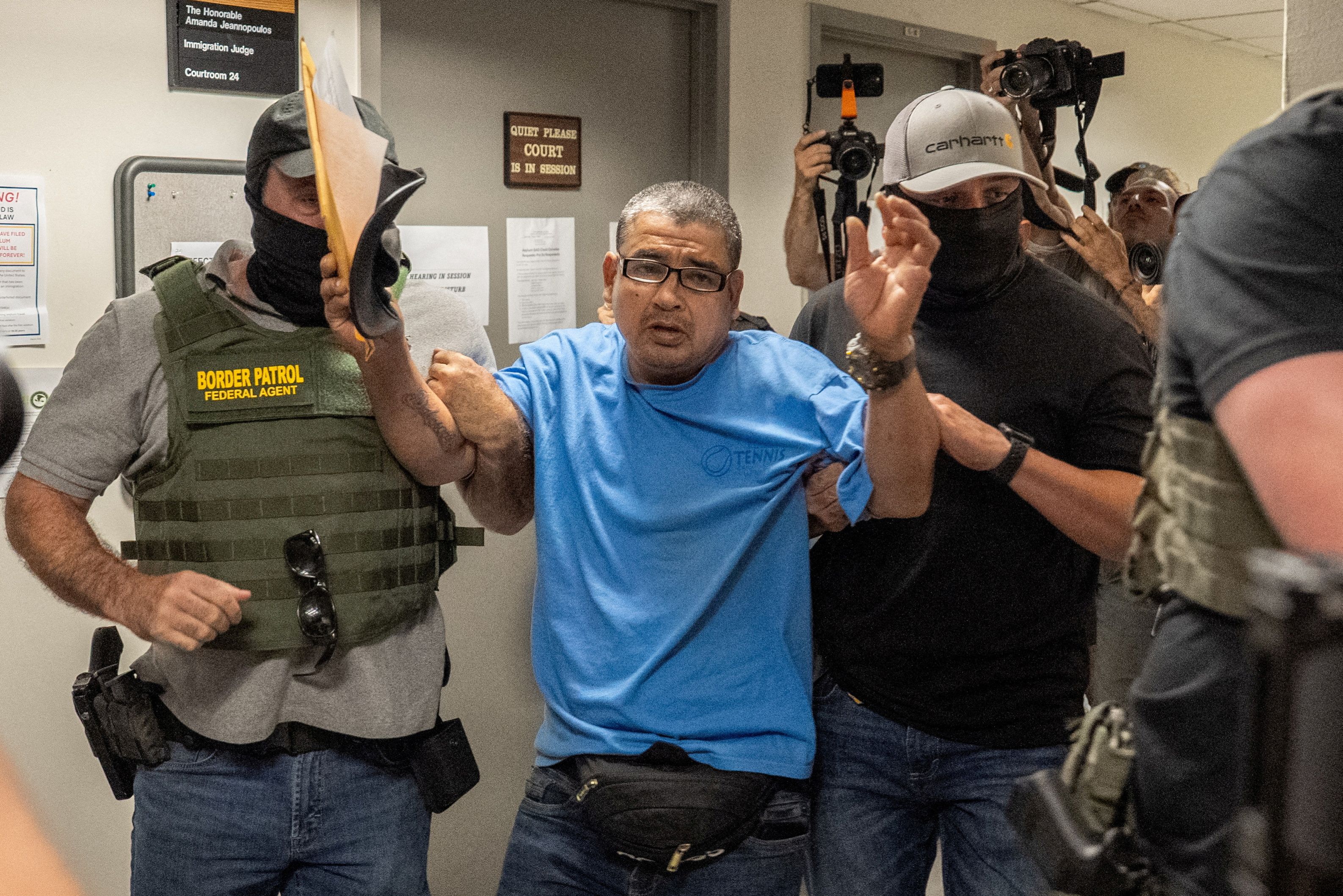A migrant is detained by federal immigration officers at U.S. immigration court in Manhattan, in New York City on July 23, 2025. (Photo by David 'Dee' Delgado/Reuters)
