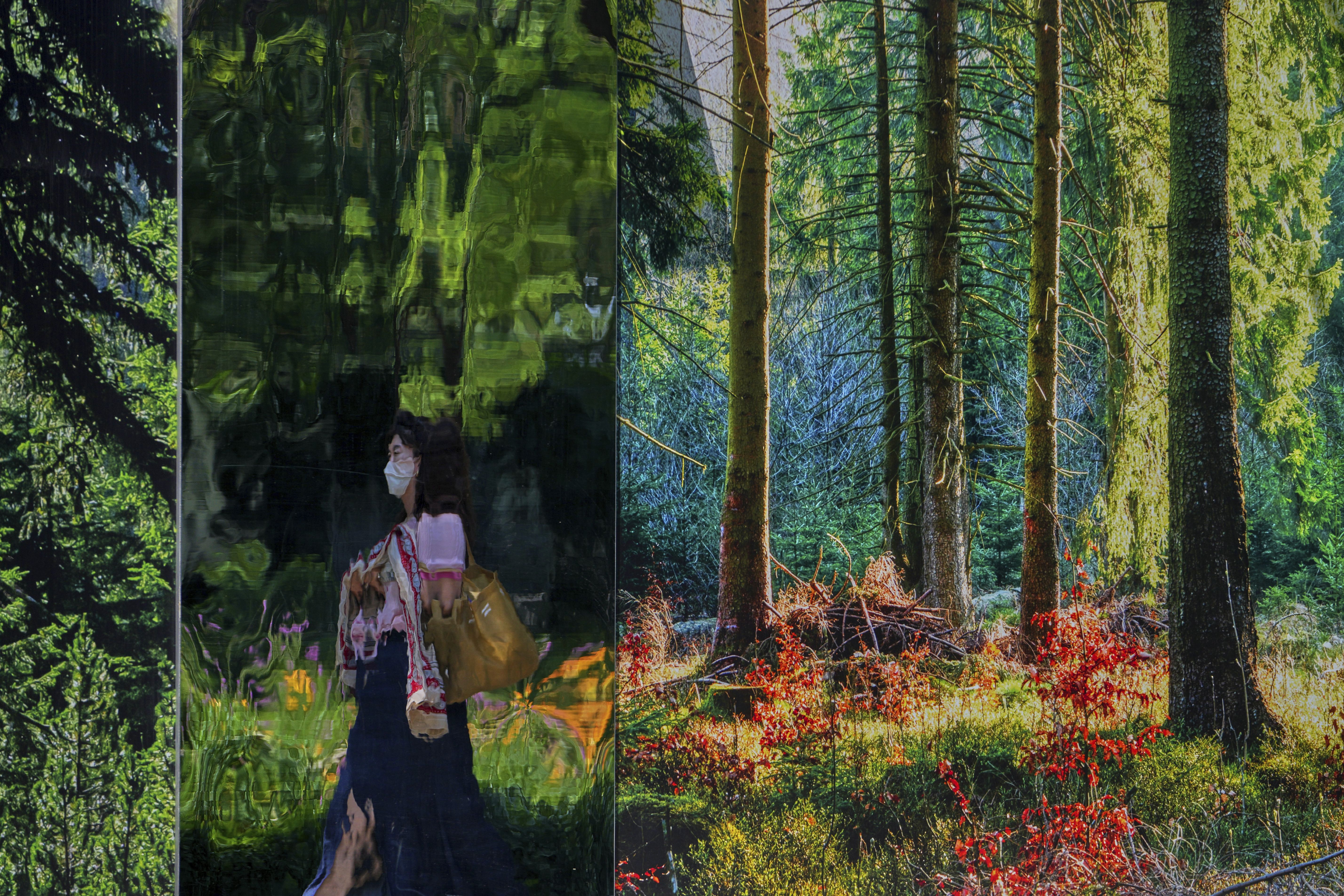 A woman is reflected on a panel of a display board depicting a forest at a construction site, in Beijing, Tuesday, June 17, 2025. (Photo by Andy Wong/AP Photo)