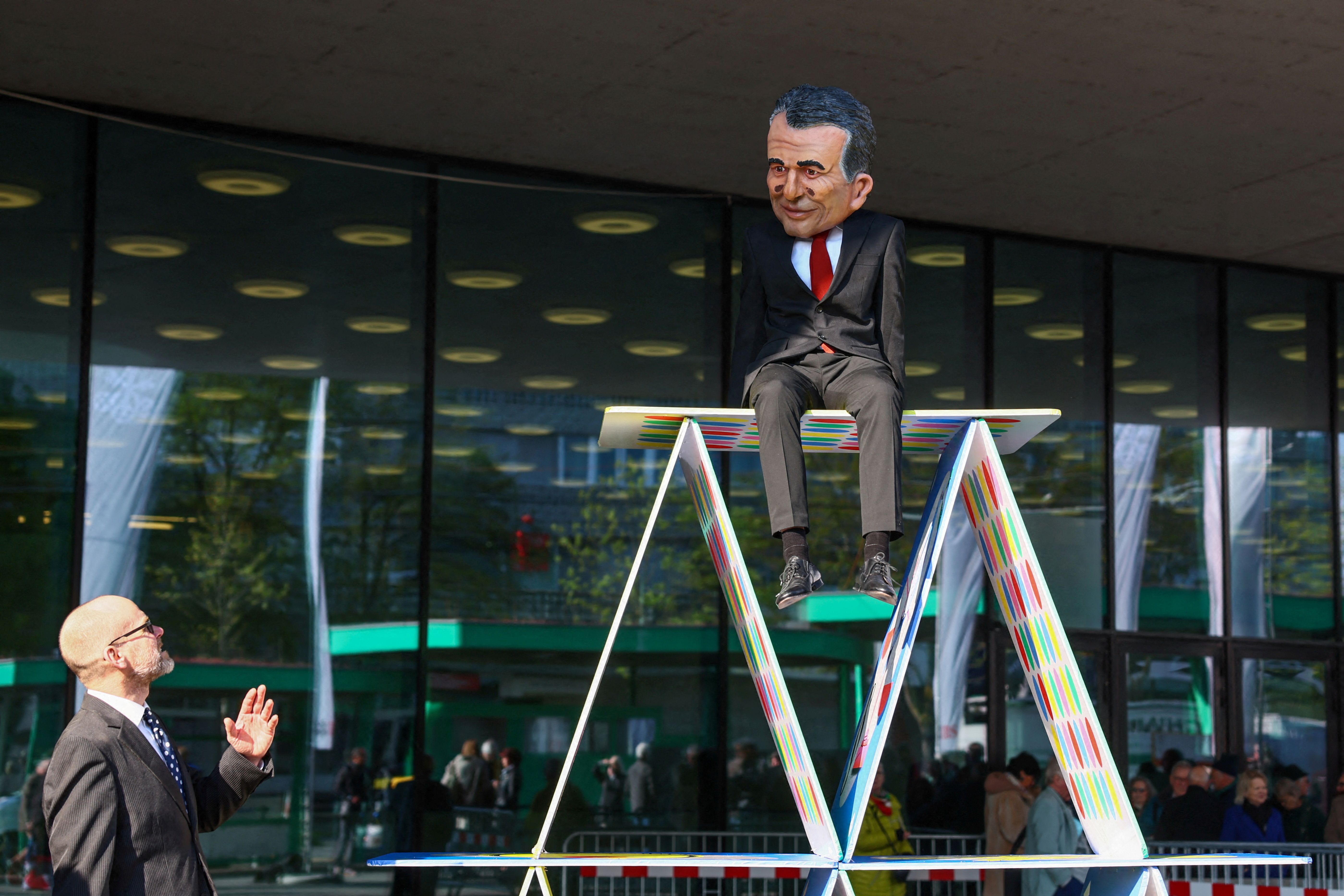 A person wearing a mask depicting CEO of UBS Group Sergio Ermotti sits on top of an house of cards, as climate activists gather in front of St. Jakobshalle where UBS holds its Annual General Meeting, one year after buying rival Swiss bank Credit Suisse, in Basel, Switzerland, on April 24, 2024. (Photo by Denis Balibouse/Reuters)
