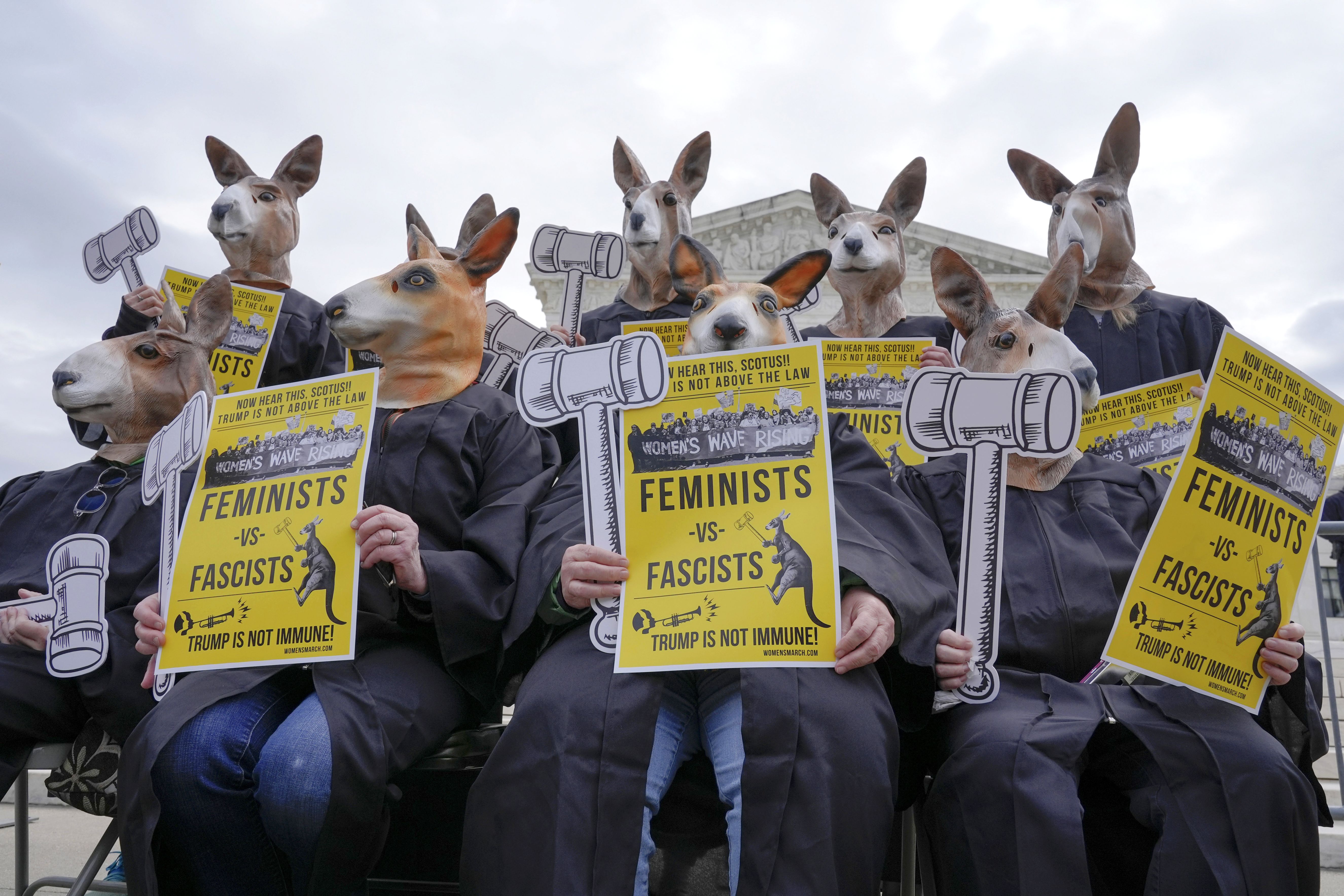 Demonstrators wearing kangaroo masks gather outside the Supreme Court as justices prepare to hear arguments on former President Donald Trump's immunity claims, on Capitol Hill in Washington, April 25, 2024. (Photo by Mariam Zuhaib/AP Photo)