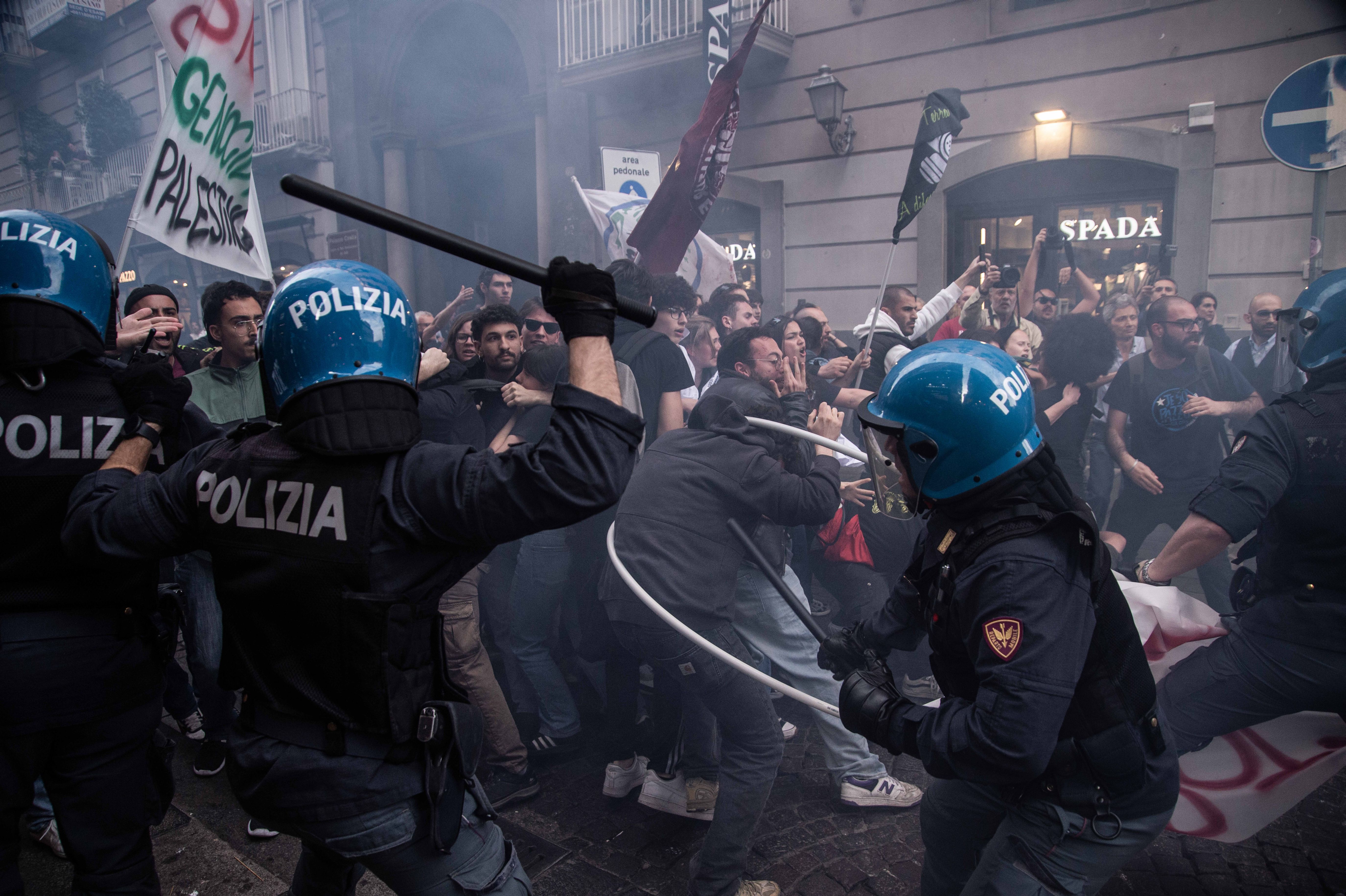 Clashes between demonstrators and police during a protest against NATO and the war on April 08, 2024 in Naples, Italy. Clashes in Naples between demonstrators and police during a pacifist protest against NATO and against the war in Palestine. The procession of demonstrators was trying to reach the San Carlo Theater where an event for the 75th anniversary of NATO was scheduled. Several protesters were injured. (Photo by Ivan Romano/Getty Images)