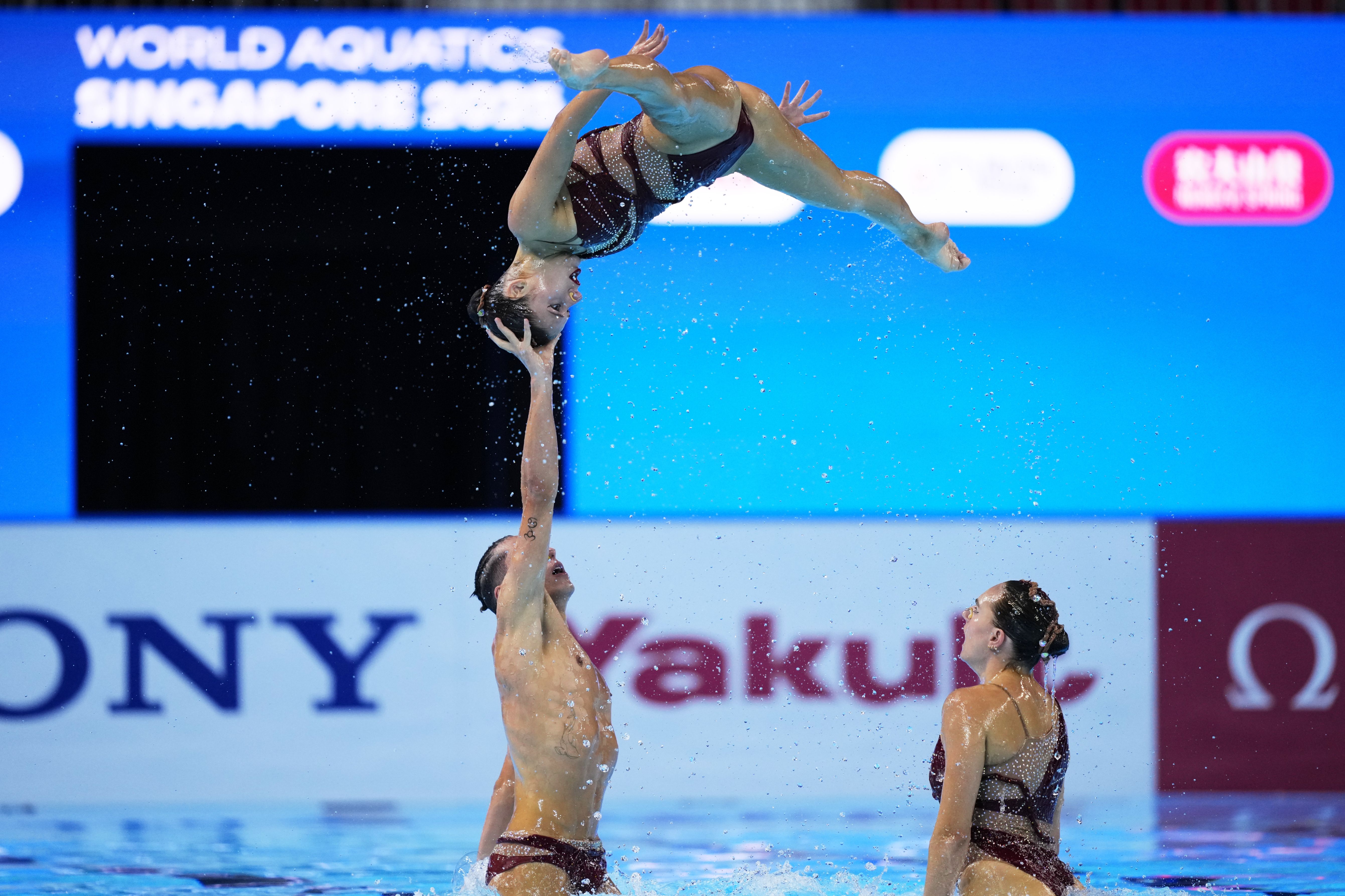 Team Spain compete in the team free final of artistic swimming at the World Aquatics Championships in Singapore, Sunday, July 20, 2025. (Photo by Vincent Thian/AP Photo)