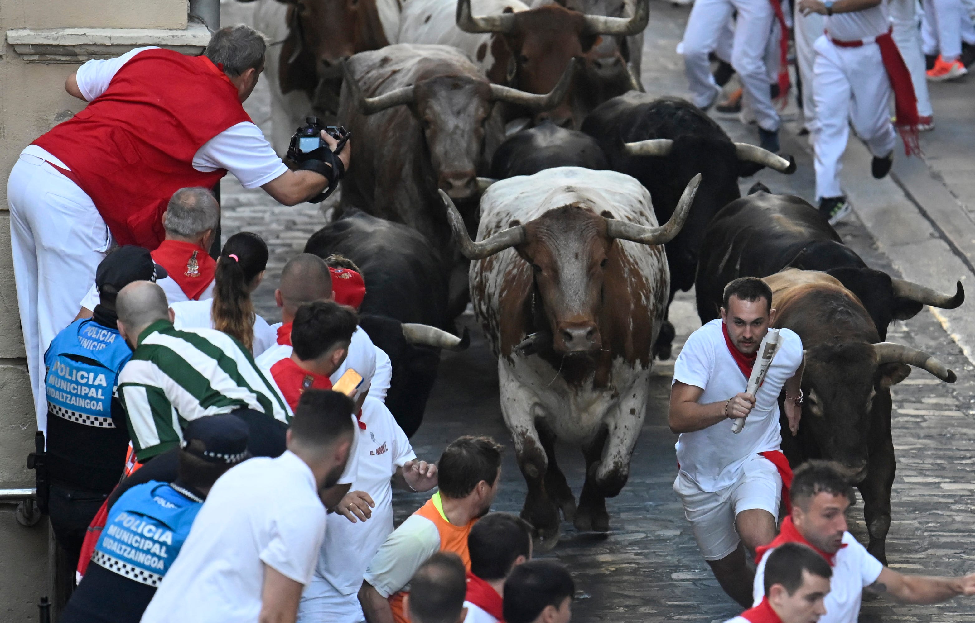 Participants run ahead of La Palmosilla breed bulls during the seventh running of the bulls of the San Fermin festival in Pamplona, northern Spain, on July 13, 2025. Thousands of people every year attend the week-long festival and its famous “encierros” or bull runs, every day at 8:00 a.m. through the narrow streets of the old town over an 850 meters (yard) course while runners ahead of them try to stay close to the bulls without falling over or being gored. (Photo by Miguel Riopa/AFP Photo)