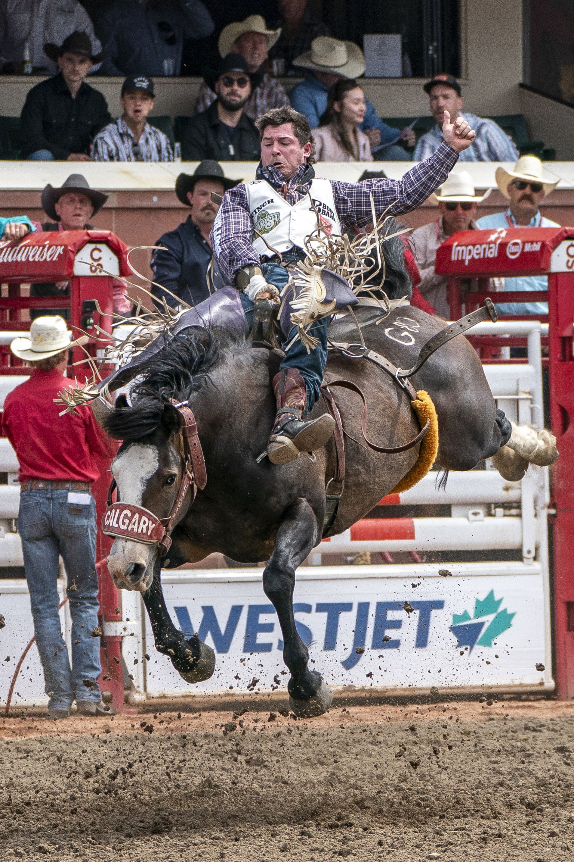 A rider competes in the rodeo during the Calgary Stampede on Saturday, July 5, 2025, in Calgary, Alberta. (Photo by Amy Harris/Invision/AP Photo)