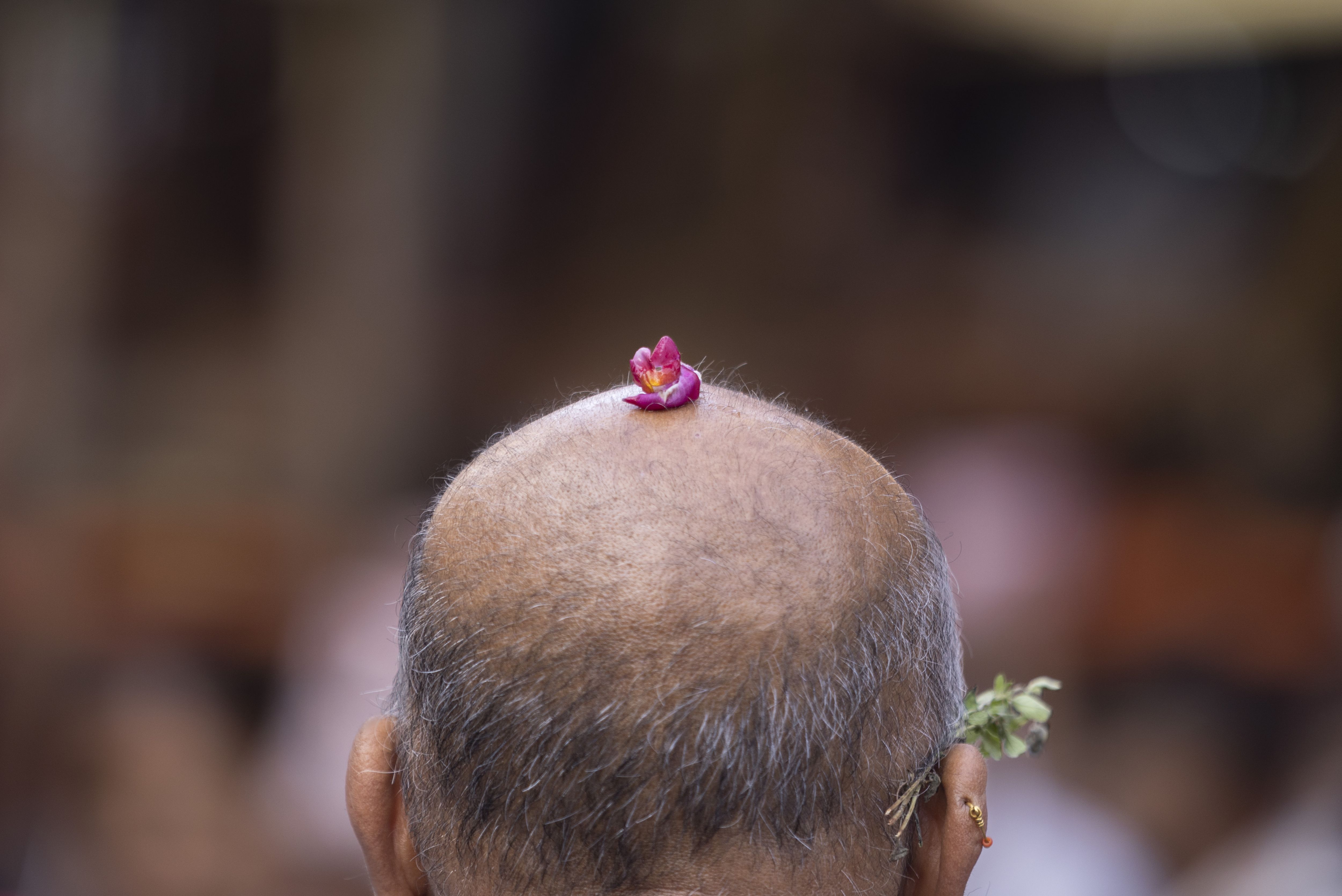 A devotee places a blessed flower on his head during the Rato Machindranath (Rain God) festival in Patan, Nepal, 13 May 2025. Hindus and Buddists in Nepal celebrate Ratomachindranath festival by pulling a 60-feet-high wooden chariot all over the valley for a month. The festival is observed annually to bring good rainfall, good harvest, prosperity and good fortune for the coming years. (Photo by Narendra Shrestha/EPA)