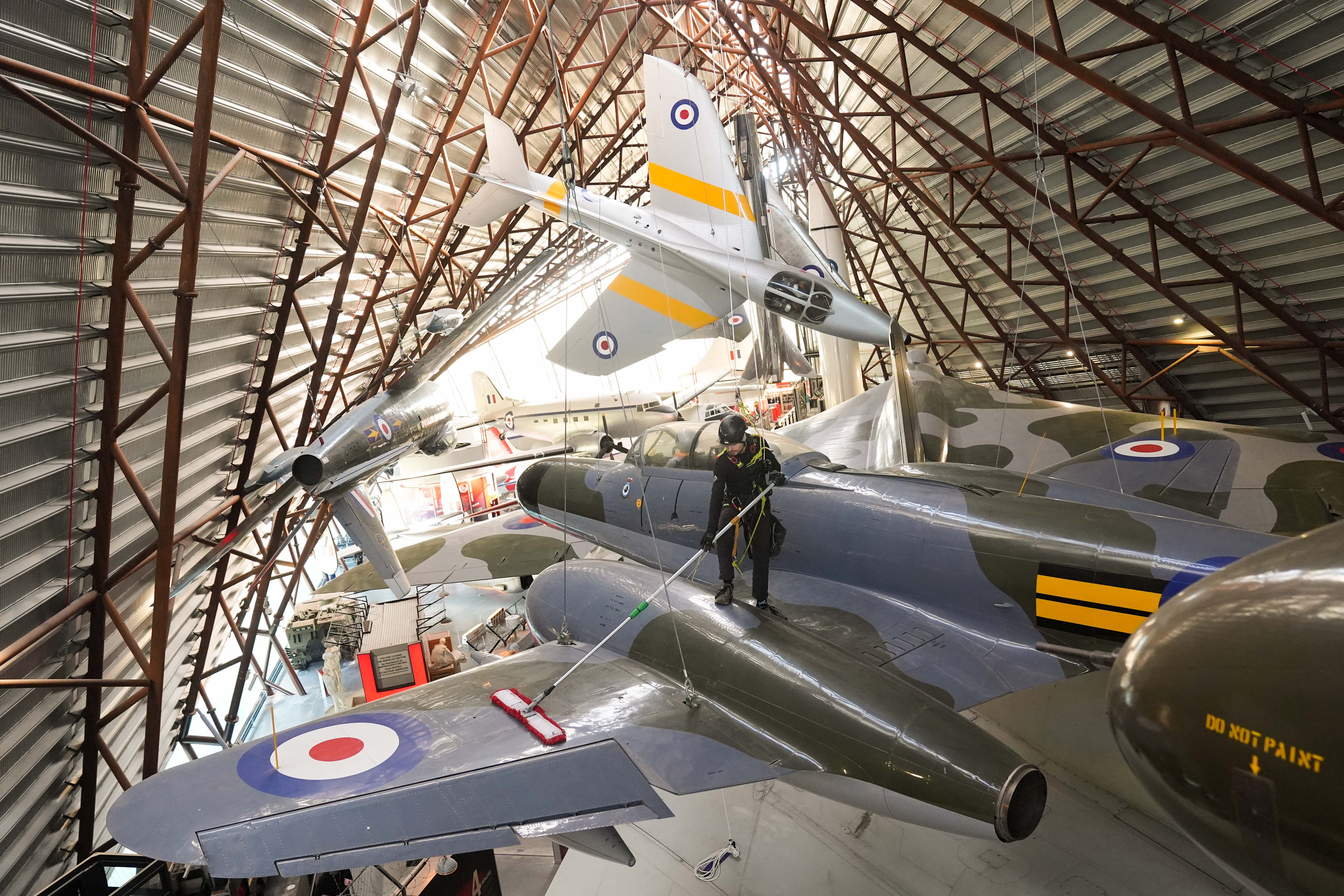 Specialists operators at the Royal Air Force Museum Midlands, in Cosford, near Telford, Shropshire, UK clean and maintain a suspended aircraft during the annual high-level aircraft cleaning within the museum's national Cold War exhibition on Tuesday, March 18, 2025. (Photo by Jacob King/PA Images via Getty Images)