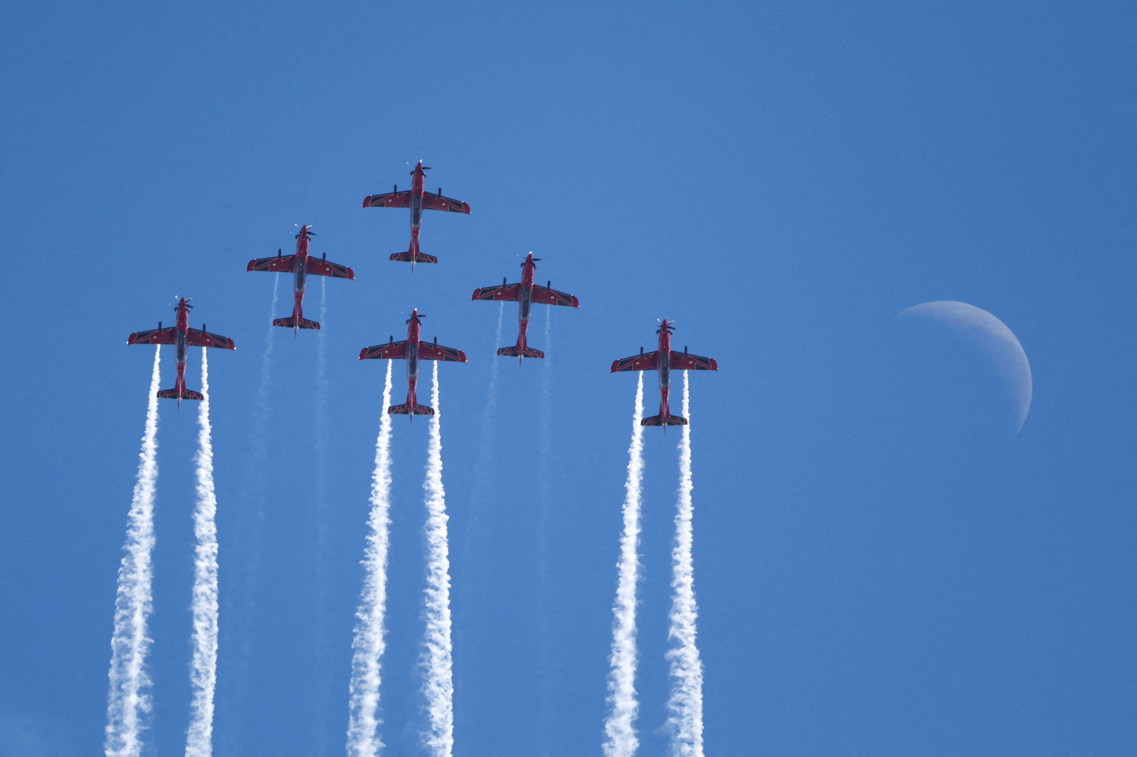 Roulettes PC-21 of the Royal Australian Air Force perform in formation as part of their aerobatic display during the Australian International Airshow in Avalon, Australia on March 25, 2025. (Photo by Hollie Adams/Reuters)