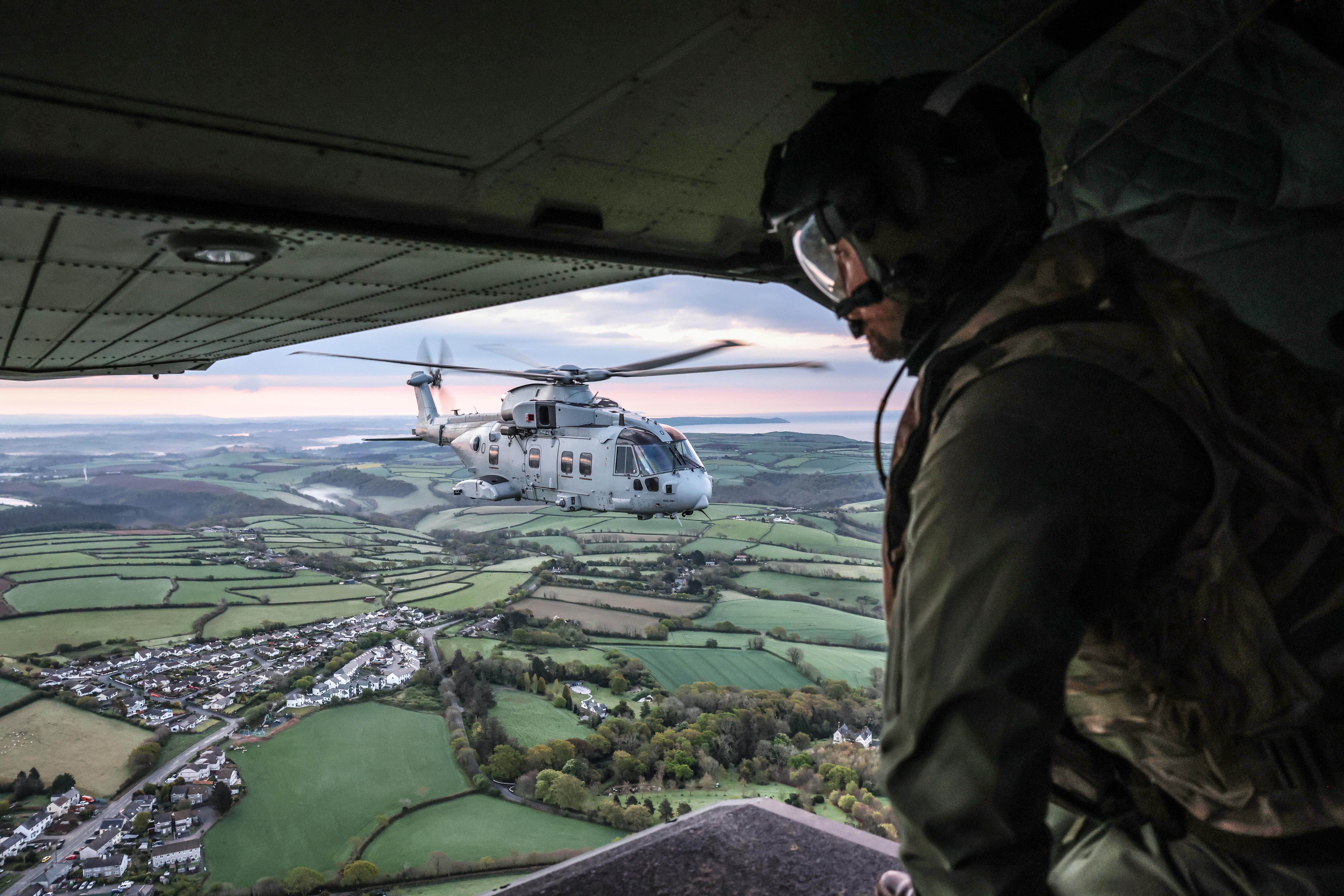 A Royal Navy Merlin helicopter on April 24, 2025 flies over the Cornish countryside to join the aircraft carrier HMS Prince of Wales, which is starting an eight-month deployment leading a multi-national fleet. (Photo by Richard Pohle/Times Media Ltd)