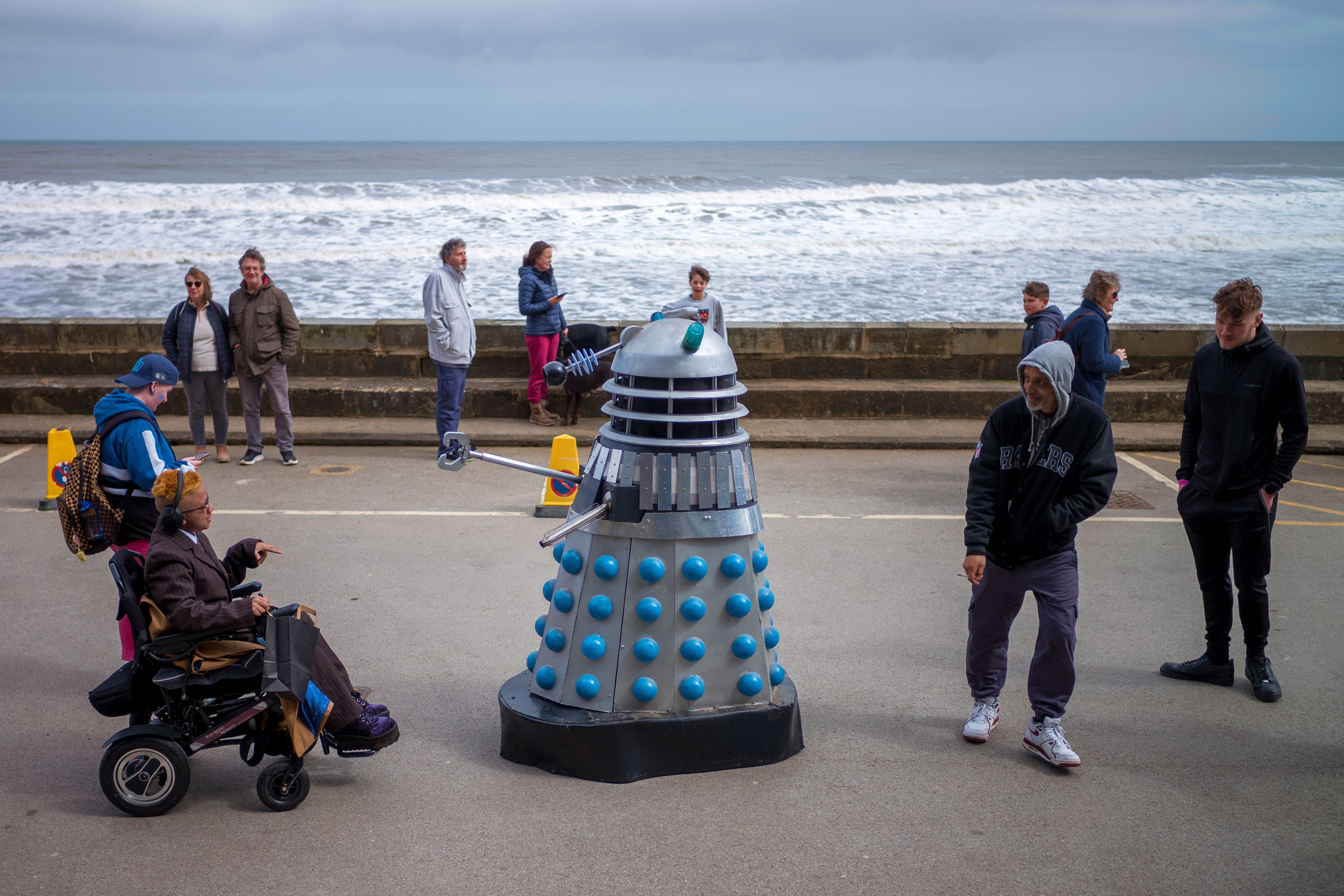 A Dalek interacts with members of the public on day one of the Scarborough Sci Fi weekend on April 20, 2024 in Scarborough, England. The North Yorkshire seaside town hosts the event at the Scarborough Spa complex and showcases many areas of Sci-Fi fandom to entertain visitors and enthusiasts including guest star appearances, panel discussions, gaming, cosplay, props, comic books and merchandise stalls with many of those attending wearing costumes and outfits of their favourite Sci-Fi characters. (Photo by Ian Forsyth/Getty Images)