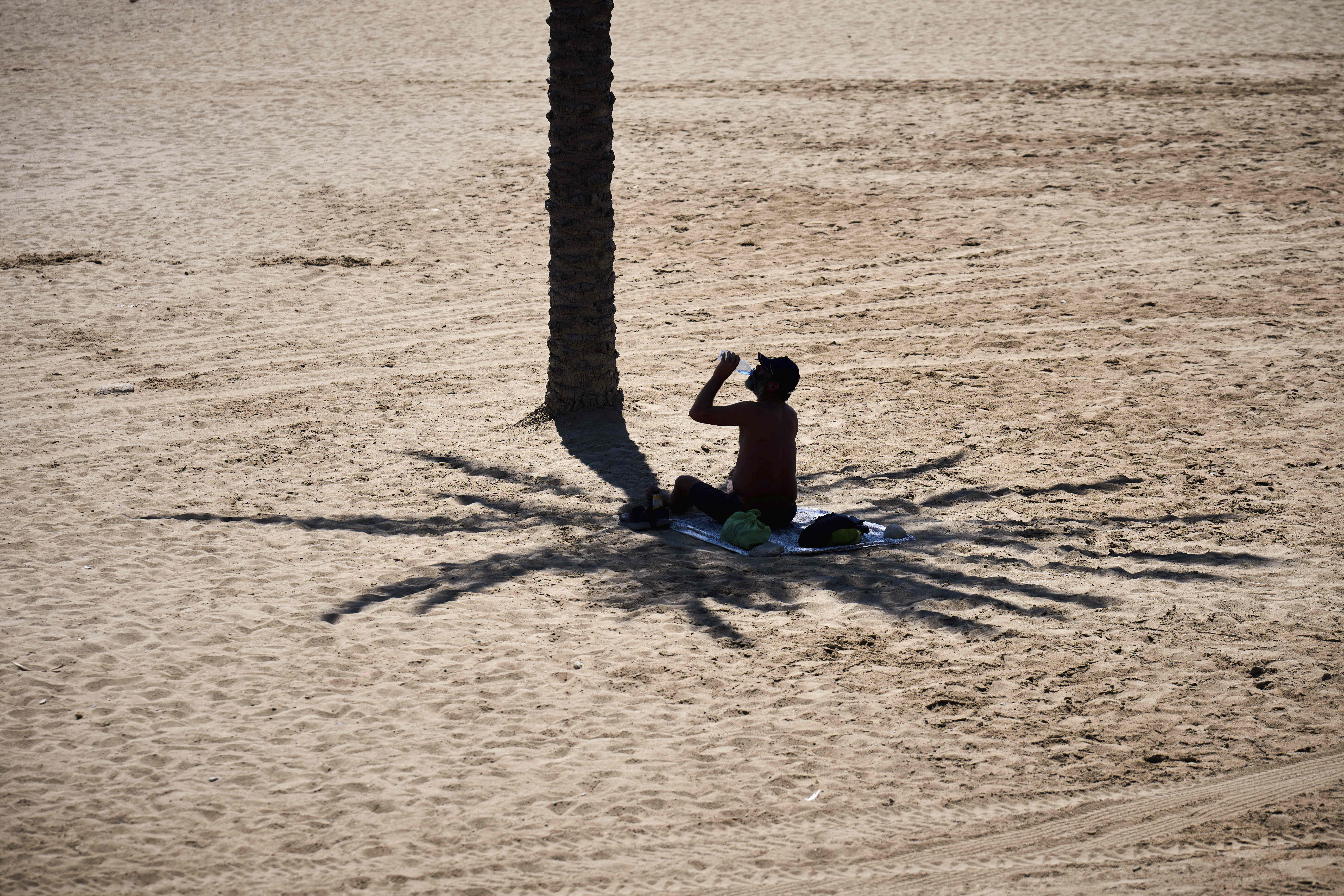 A man takes advantage of the shade of a palm tree to protect himself from the sun while hydrating himself by drinking water, on a hot day at the beach in Barcelona, Spain, Wednesday, July 2, 2025. (Photo by Emilio Morenatti/AP Photo)