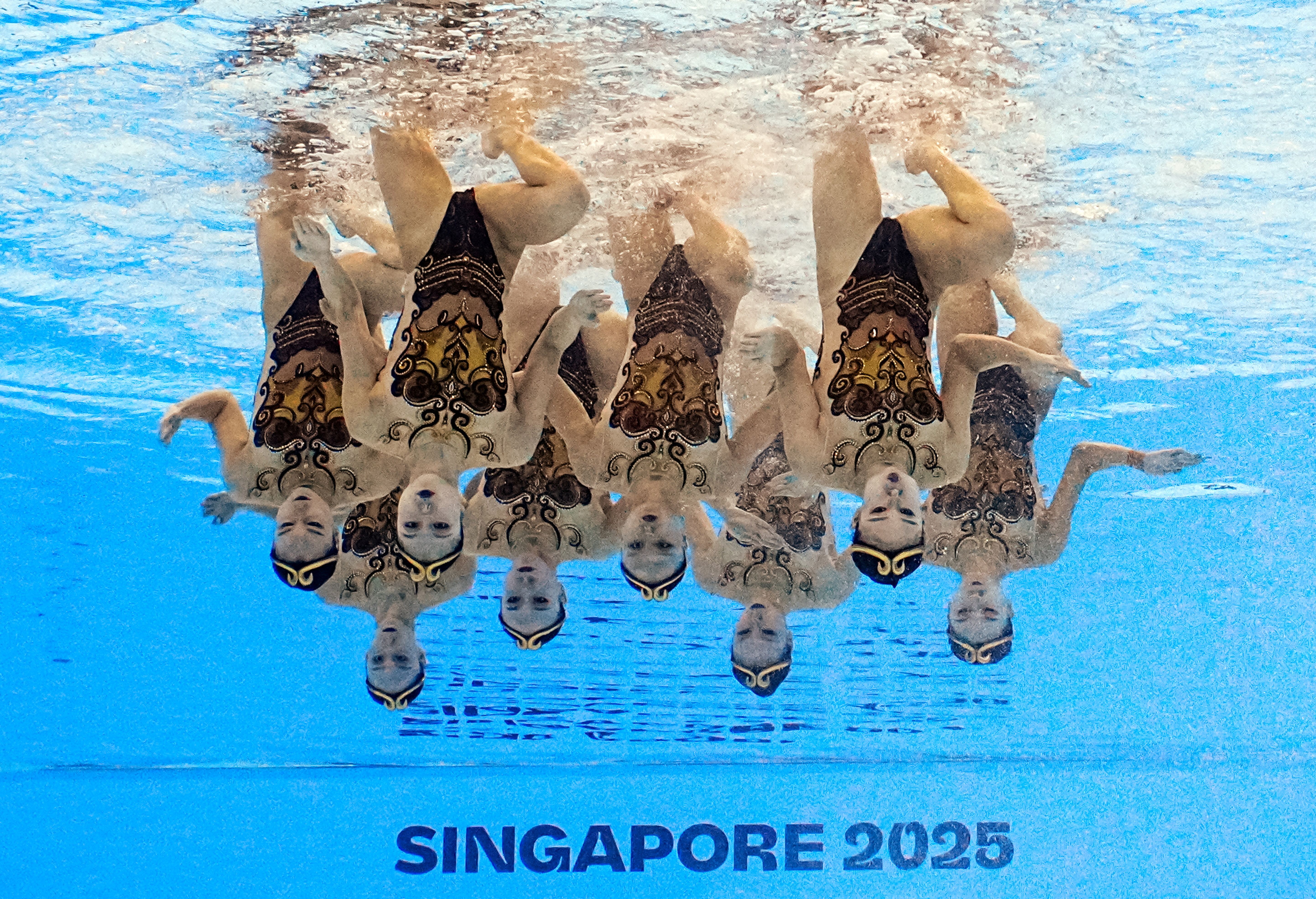Team China perform during the artistic swimming final at the World Aquatics Championships at World Aquatics Championships Arena on July 22, 2025 in Singapore. (Photo by Marko Djurica/Reuters)