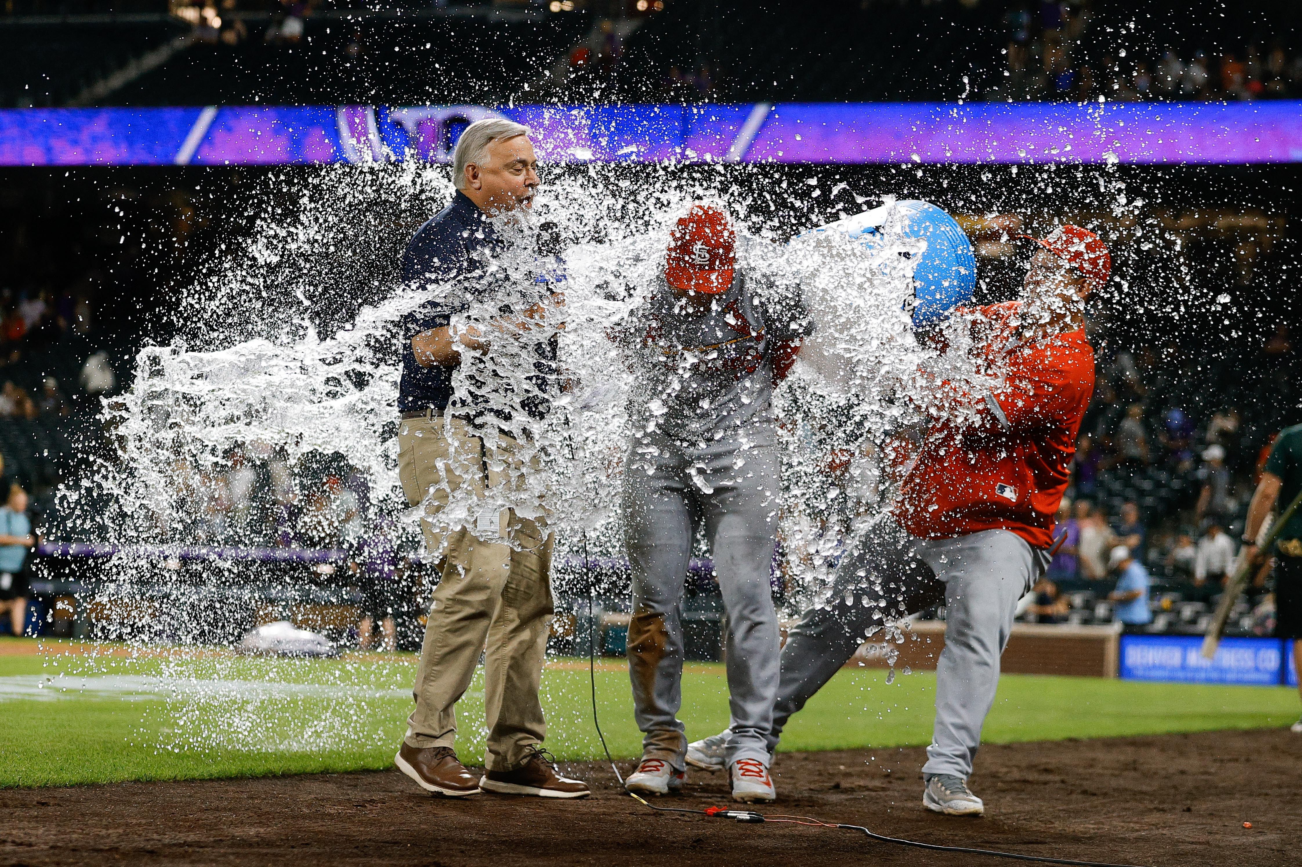 St. Louis Cardinals first baseman Willson Contreras (40) is hit with ice water during an interview after the game against the Colorado Rockies at Coors Field in Denver, Colorado on July 21, 2025. (Photo by Isaiah J. Downing/Imagn Images)