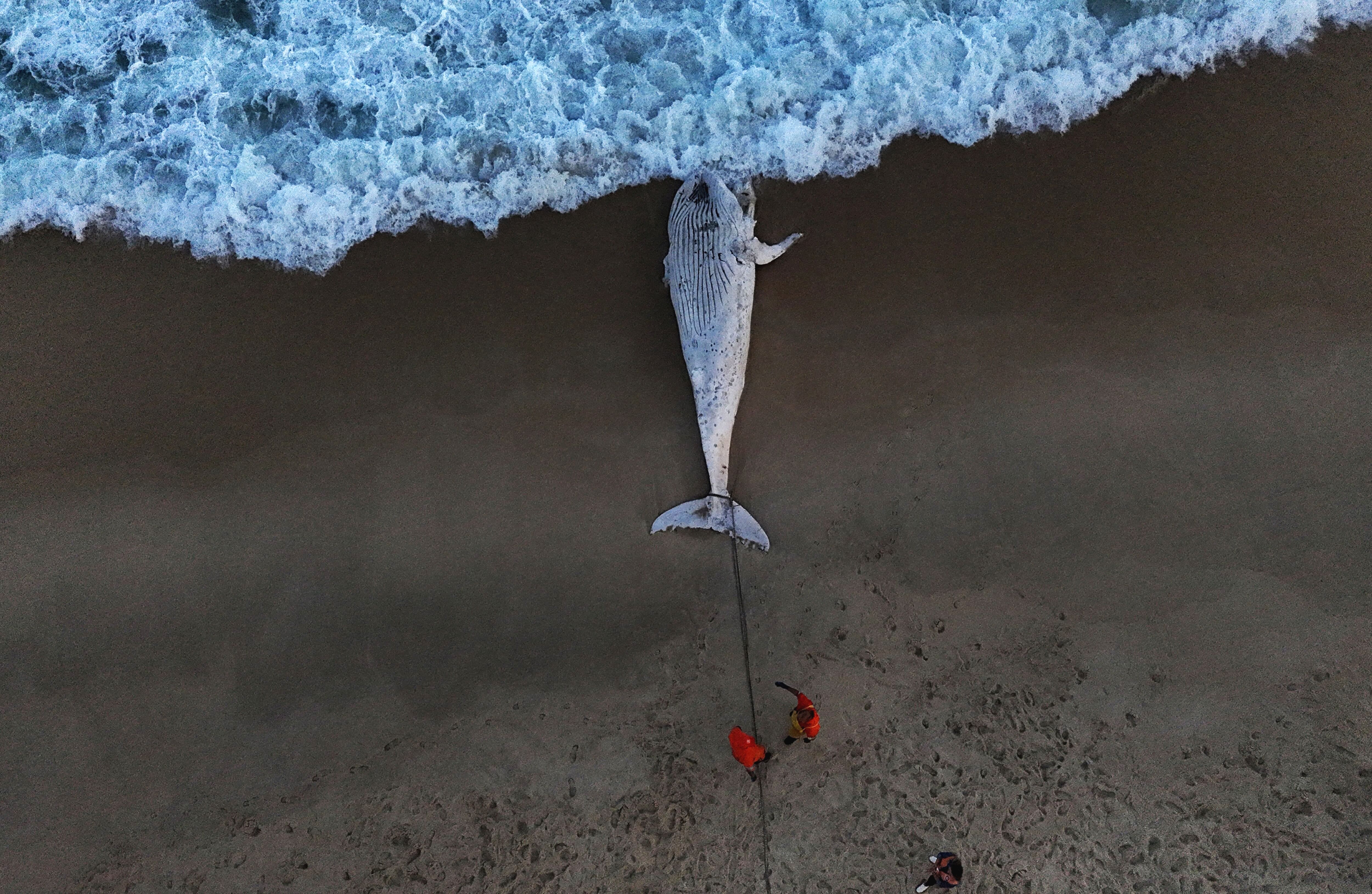 A drone view shows workers trying to remove a dead humpback whale on the shore of Sao Conrado beach in Rio de Janeiro, Brazil on July 21, 2025. (Photo by Pilar Olivares/Reuters)
