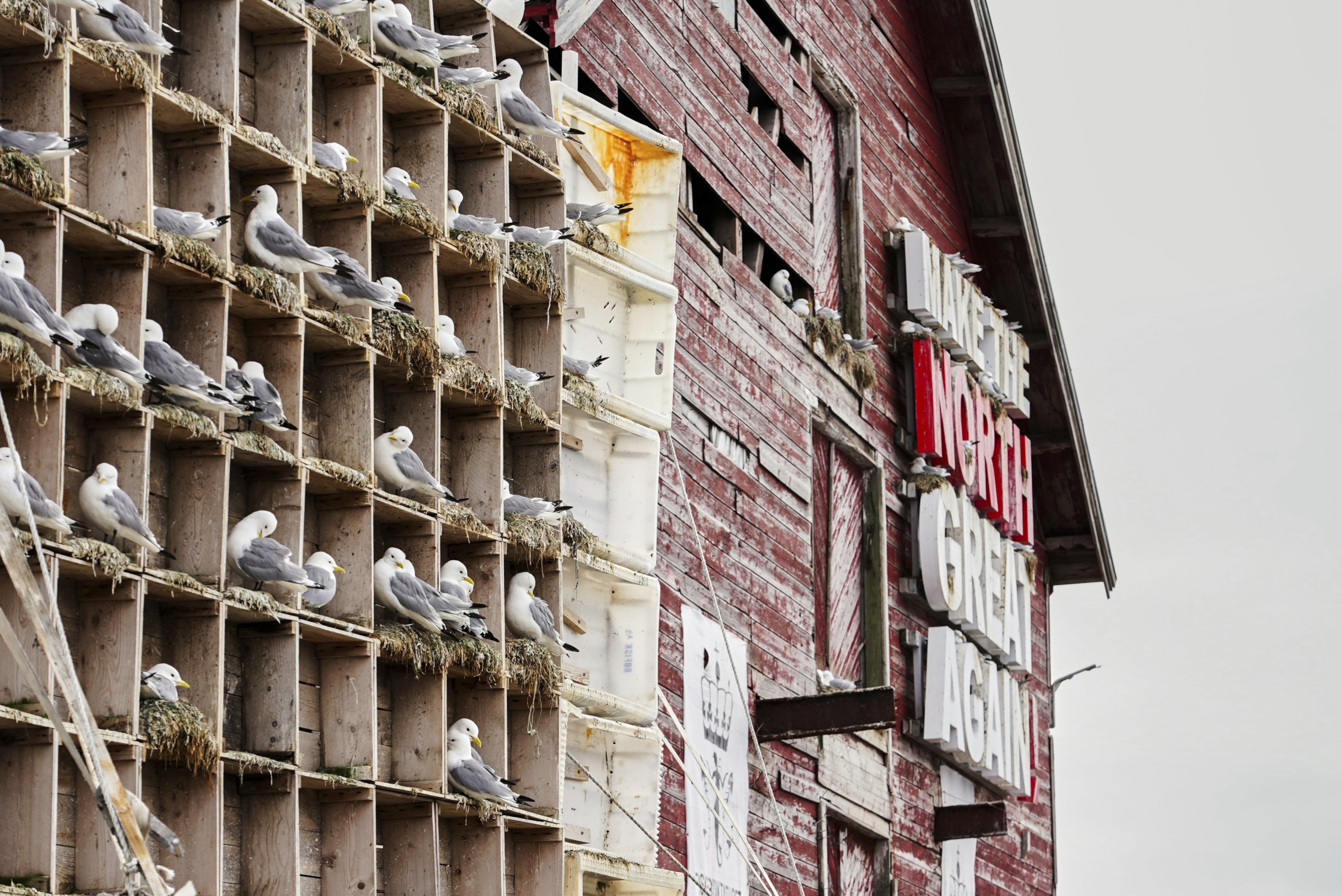 Seagulls sit in boxes of a so called Seagull Hotel at the harbour in Vardo, Norway, on July 3, 2025. (Photo by Tommi Ojala/AP Photo)