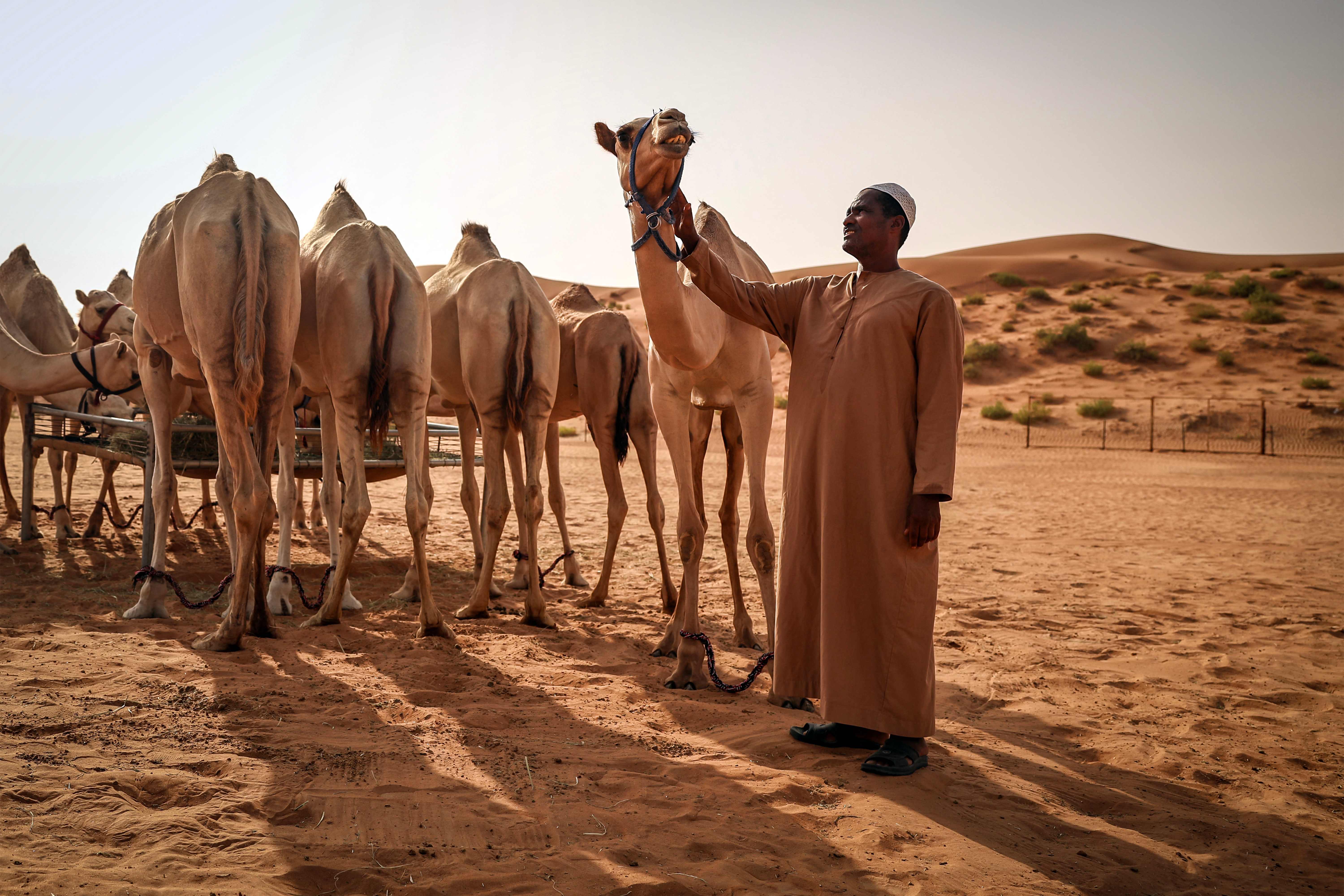 A man tends to a flock of camels in al-Ain in the gulf emirate of Abu Dhabi on July 19, 2025. (Photo by Fadel Senna/AFP Phoot)