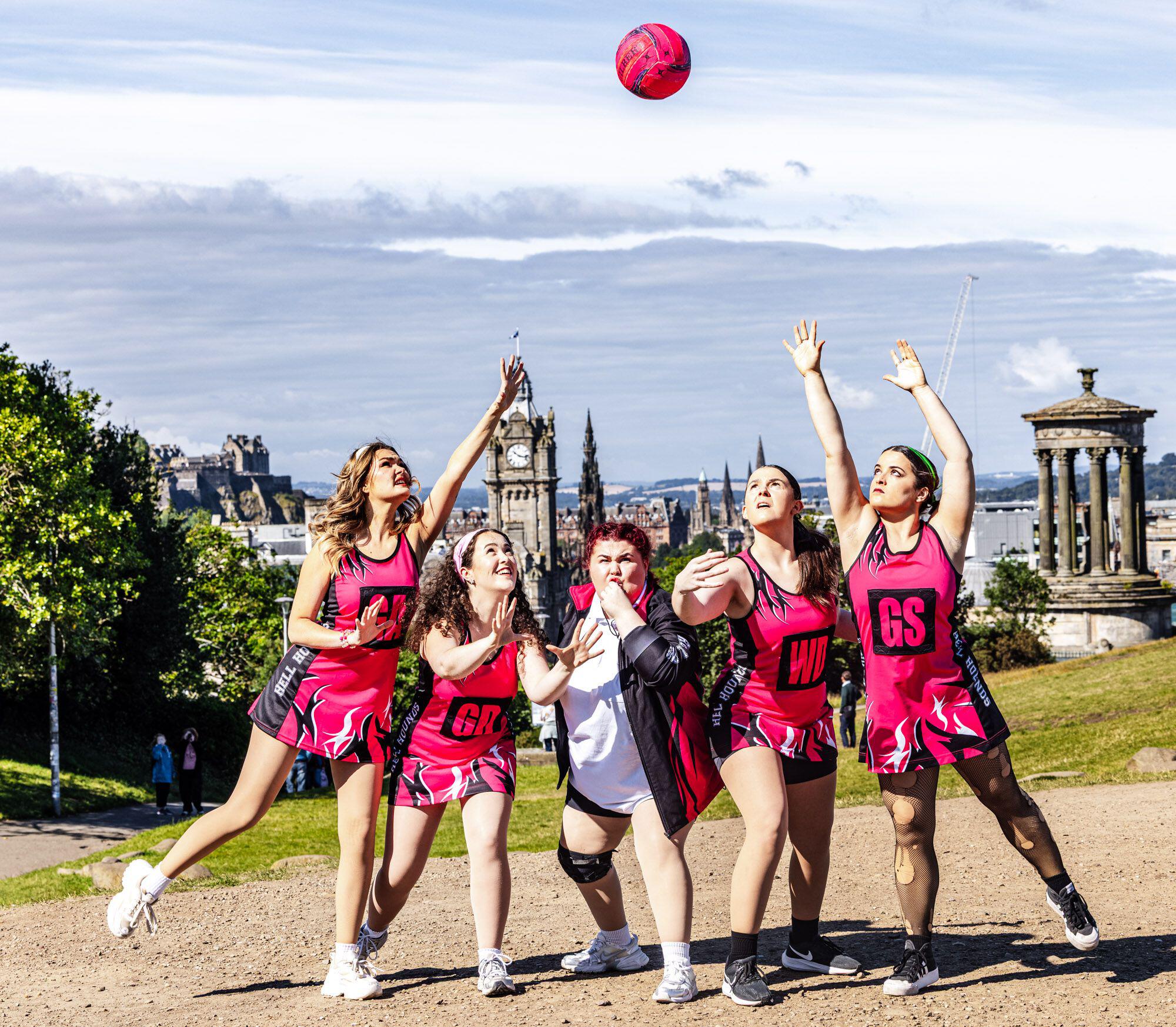 Performers from Crash Theatre Co dressed in pink netball vests on Edinburgh's Calton Hill on July 28, 2025. The House of Oz production, Lady Macbeth Played Wing Defence will open at the Edinburgh Fringe Festival from 30 July until 25 August. (Photo by Rich Dyson/Alamy Live News)