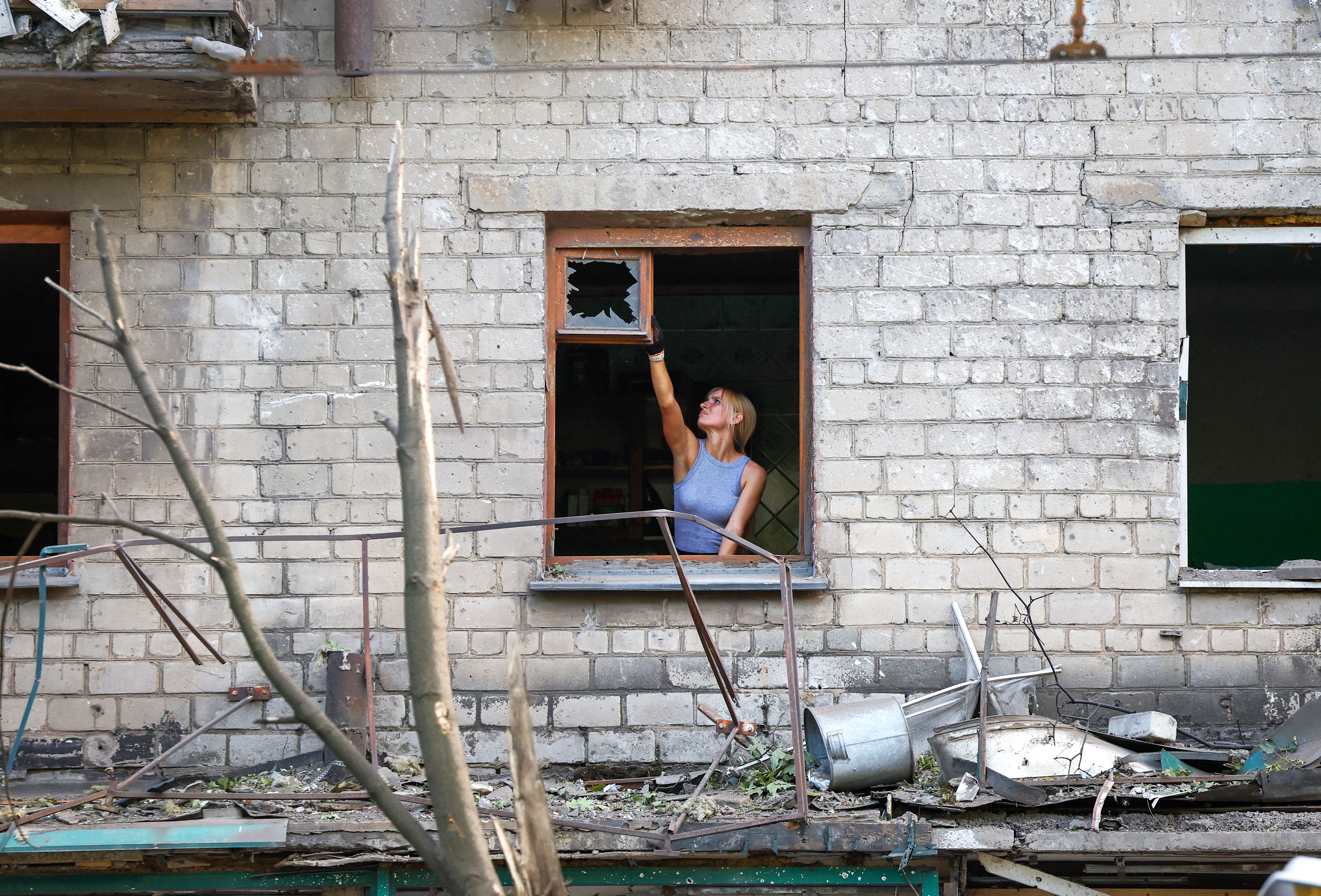 A woman removes a broken glass in a damaged apartment building after the shelling, which local Russian-installed authorities called a Ukrainian military strike, in the course of Russia-Ukraine conflict, in Donetsk, Russian-controlled Ukraine, on July 19, 2025. (Photo by Alexander Ermochenko/Reuters)