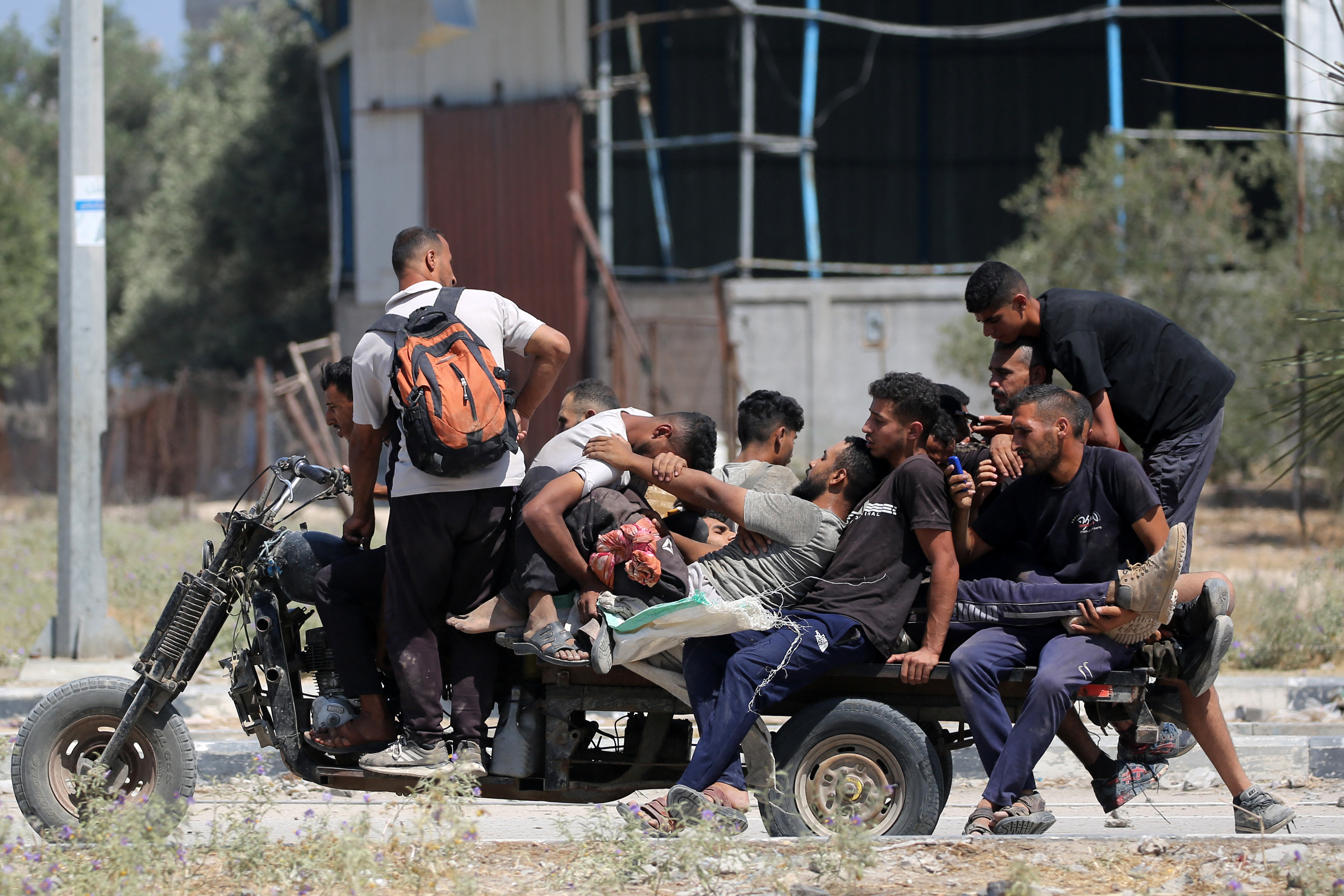 People transport Palestinians who were shot while seeking aid at a US-backed Gaza Humanitarian Foundation distribution point, at the entrance of the Bureij refugee camp in the central Gaza Strip on July 27, 2025. (Photo by Eyad Baba/AFP Photo)