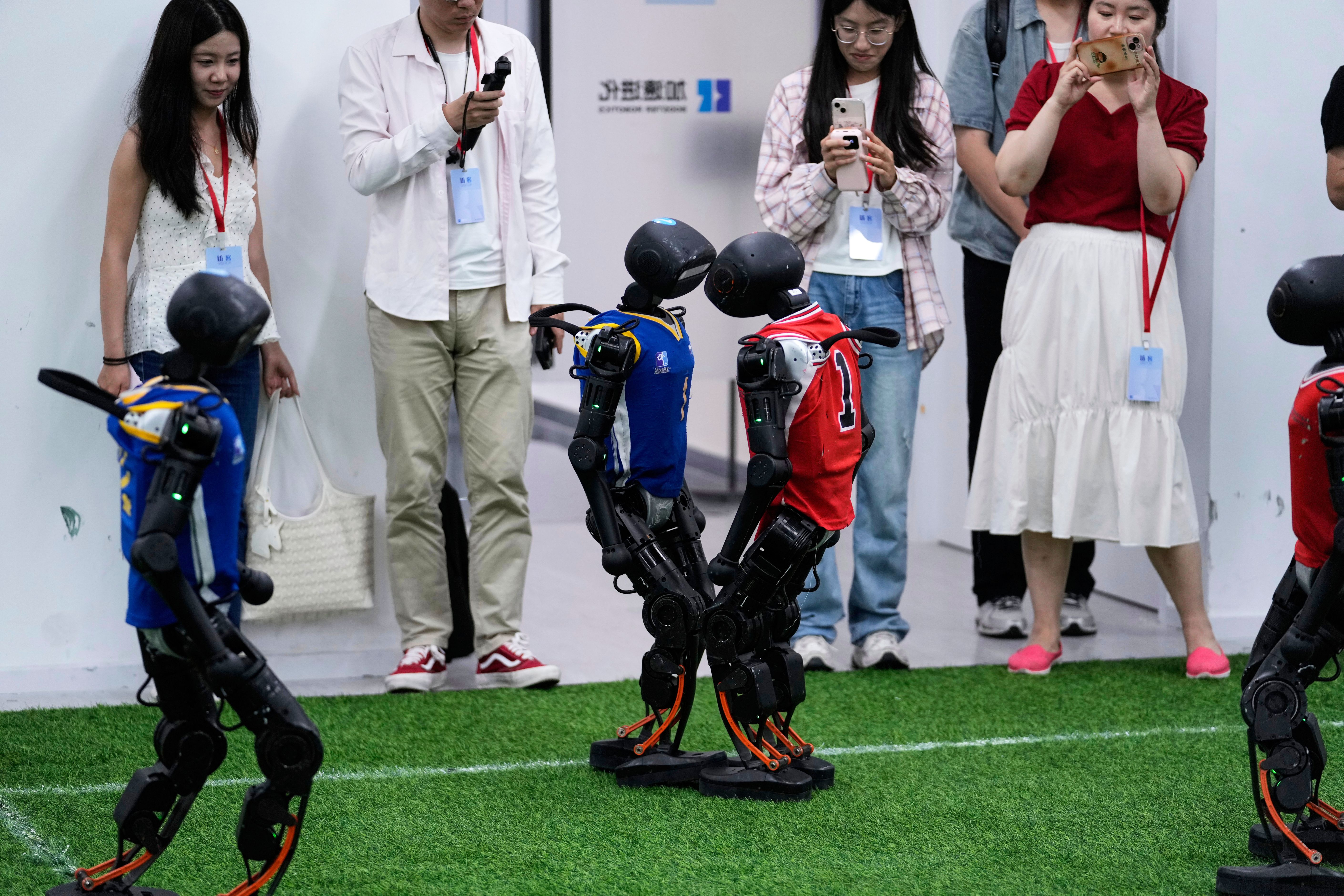 K1 robots from Booster Robotics operate before leaving for the Brazil Robocup at a pre-competition exploration camp in Beijing, Wednesday, July 9, 2025. (Photo by Mahesh Kumar A./AP Photo)