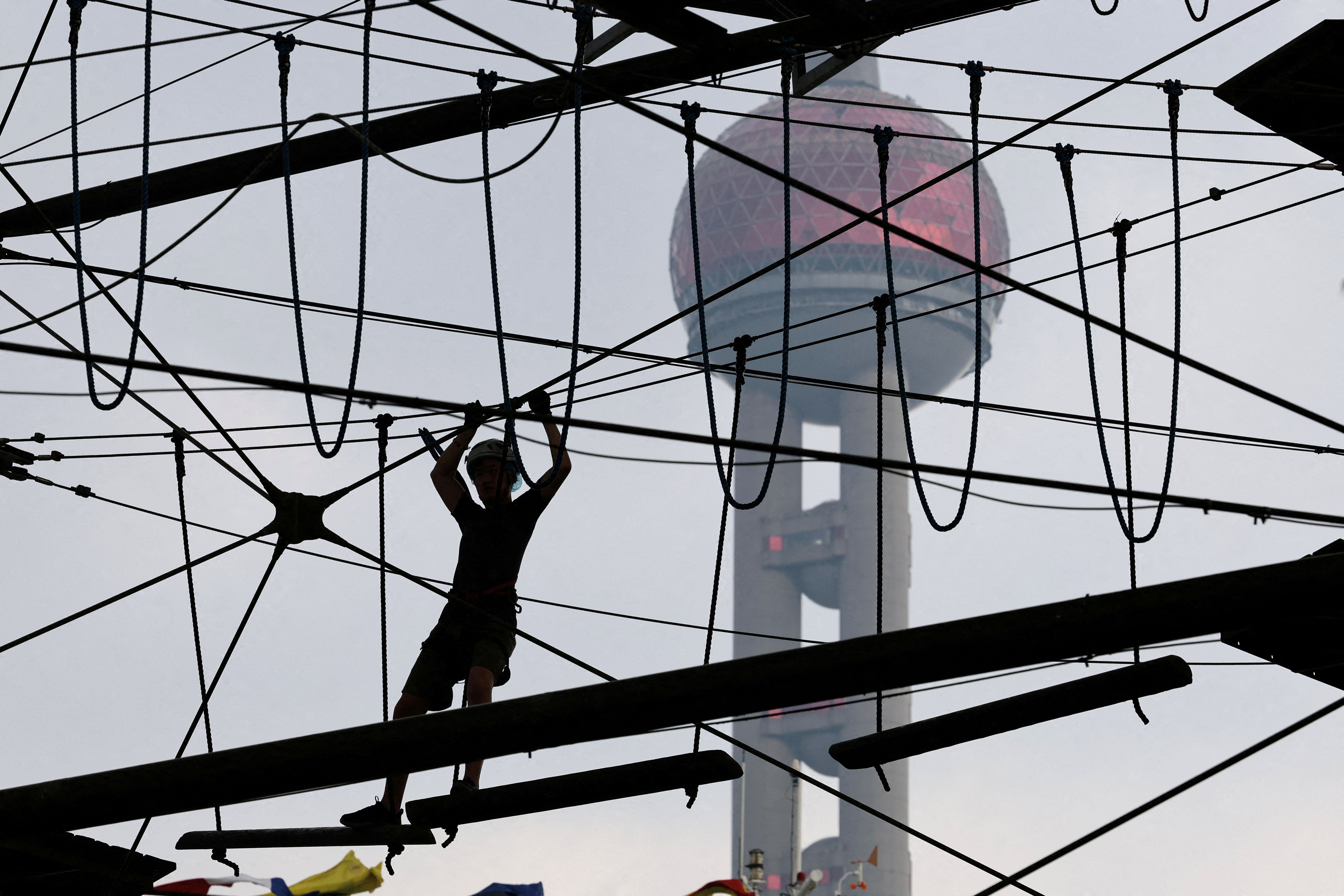 A person crosses a wire bridge at an athletic playground in Shanghai, China on July 10, 2025. (Photo by Go Nakamura/Reuters)