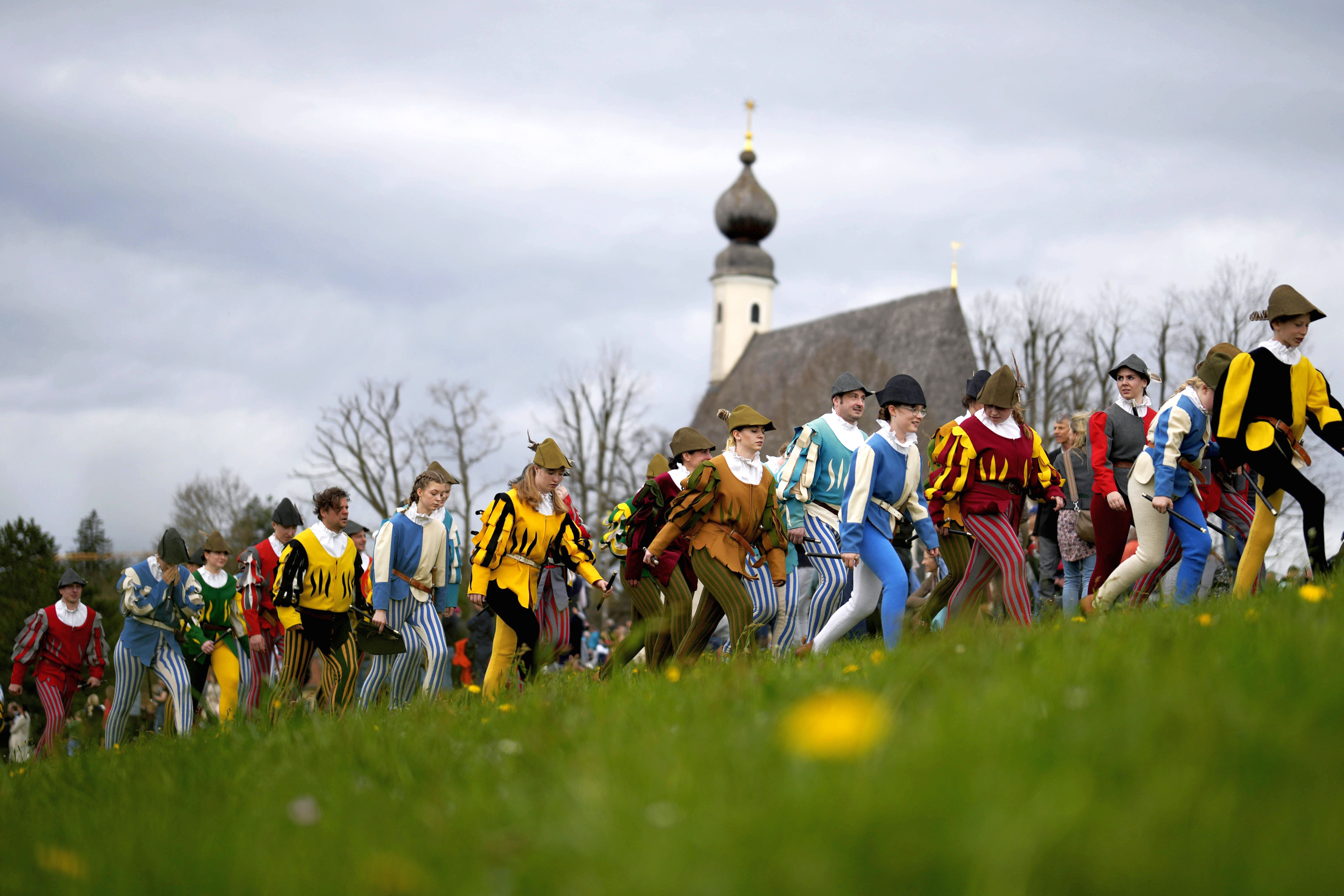 Local residents of the region wearing traditional costumes make their way to get blessings for men and animals, at the St. George church in Traunstein, Germany, Monday, April 1, 2024. (Photo by Matthias Schrader/AP Photo)