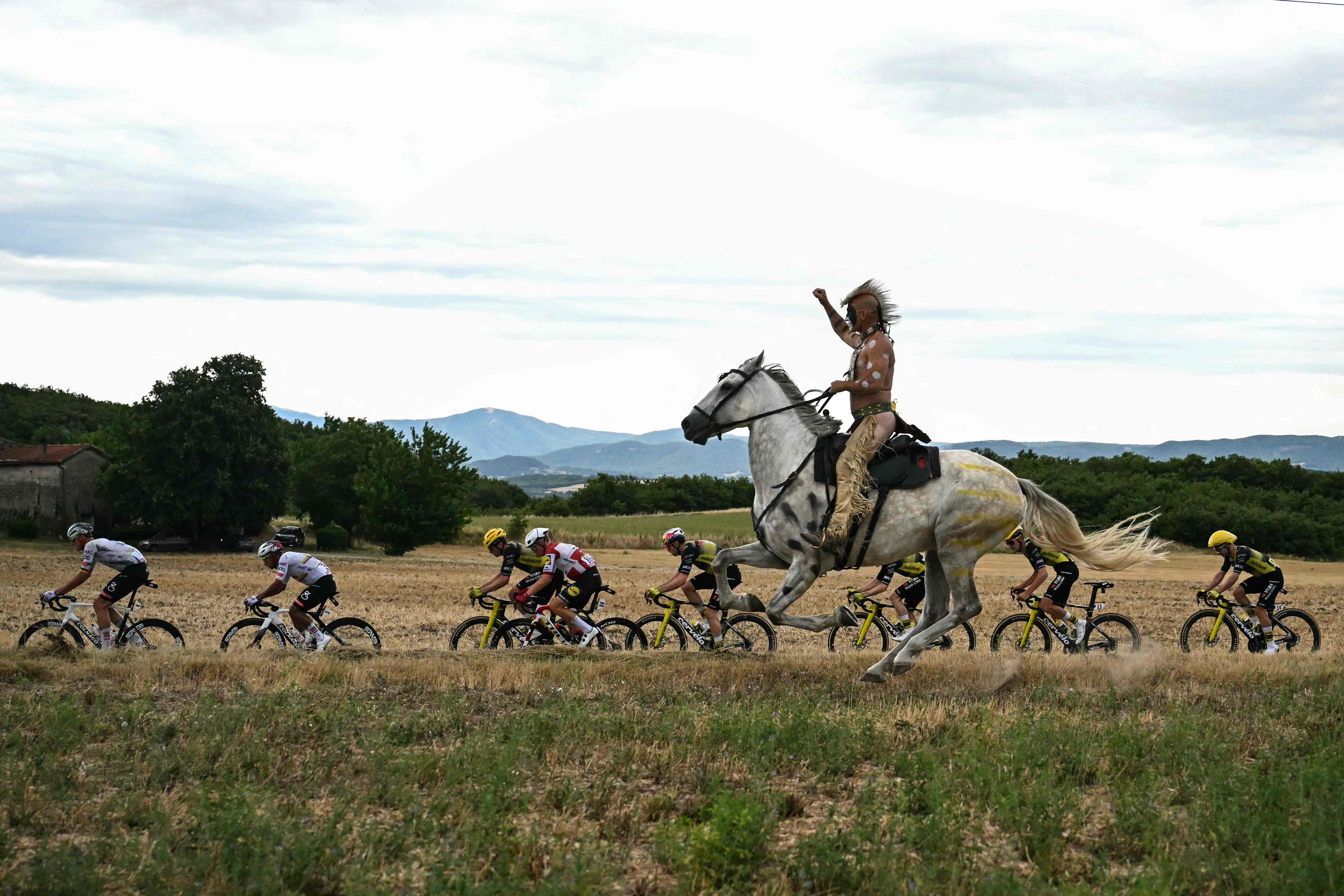 A man on horseback rides alongside the pack of riders (peloton) during the 17th stage of the 112th edition of the Tour de France cycling race, 160.4 km between Bollene and Valence, southern France, on July 23, 2025. (Photo by Loic Venance/AFP Photo)