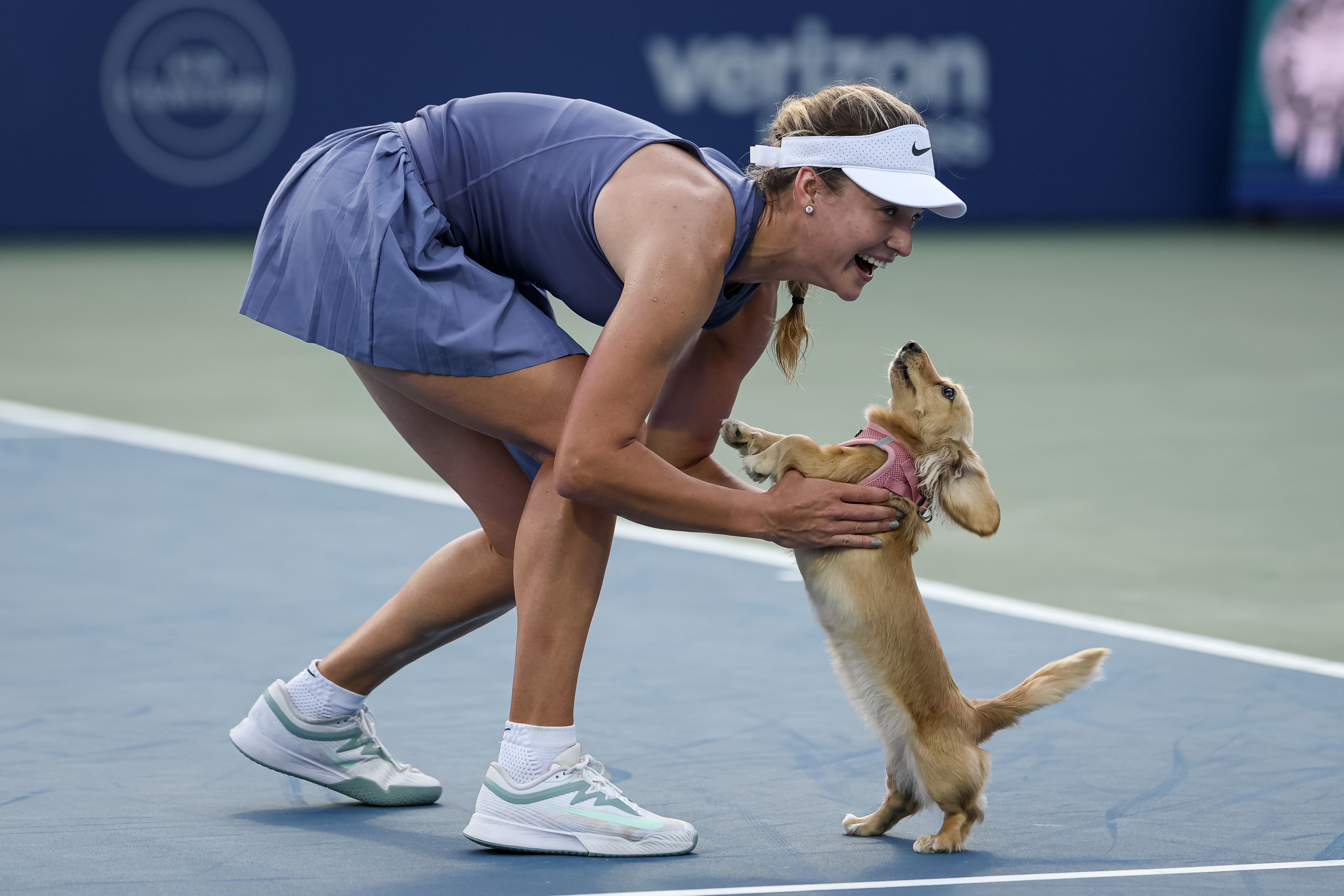 Anna Kalinskaya celebrates with her dog Bella on the court after winning her women's singles match against Emma Raducanu of the United Kingdom on day 6 of the Mubadala Citi DC Open 2025 at William H.G. FitzGerald Tennis Center on July 26, 2025 in Washington, DC. (Photo by Scott Taetsch/Getty Images)