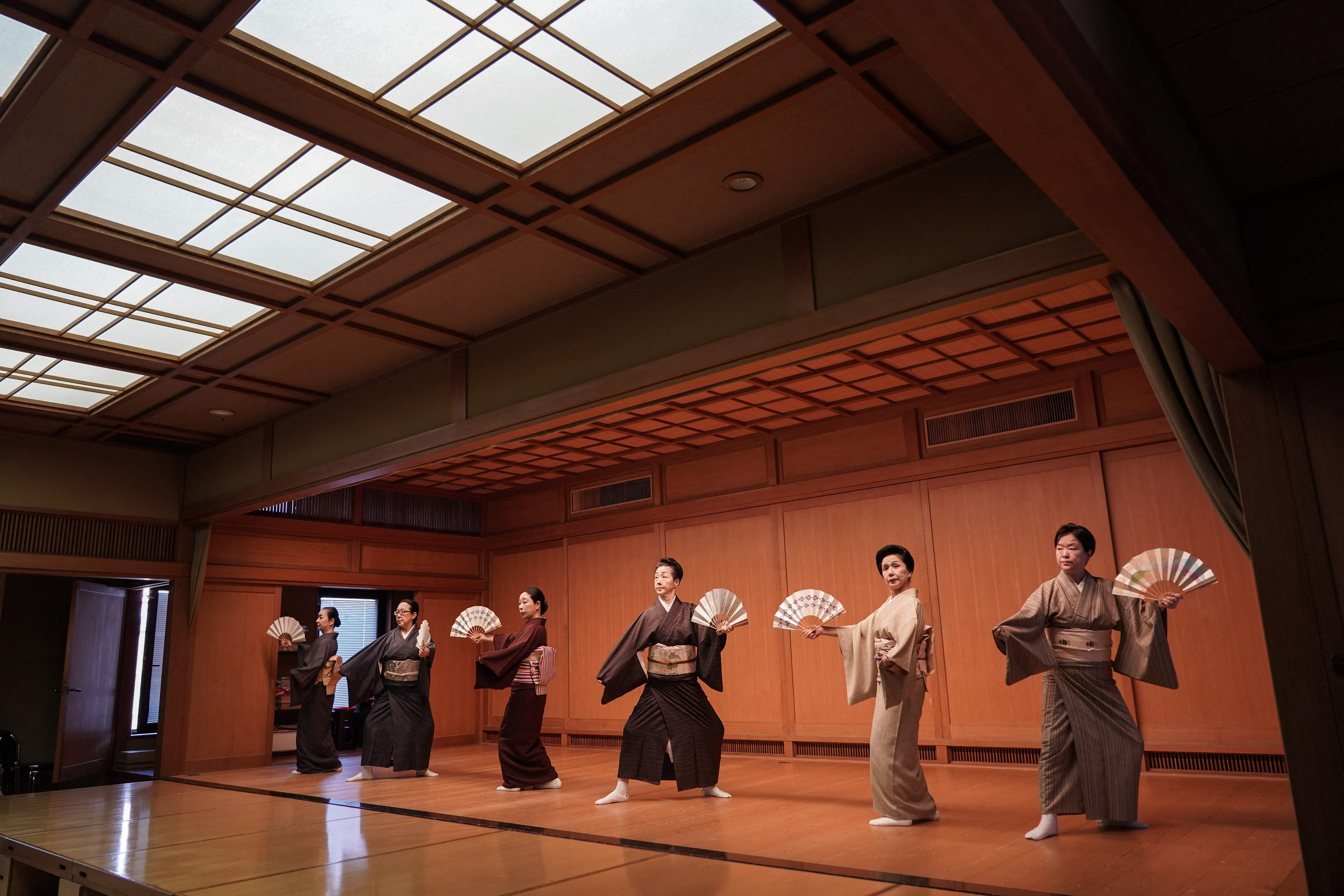 This photo taken on May 8, 2025 shows Shinbashi geishas rehearsing under the watchful eyes of instructors before the 100th edition of the Azuma Odori at the Shinbashi Enbujo Theatre in Tokyo. Geishas are a rare sight in modern Japan, but some of the few still working in Tokyo glide with measured steps across a wooden stage, offering a glimpse of a long-misunderstood tradition. (Photo by Caroline Gardin/AFP Photo)