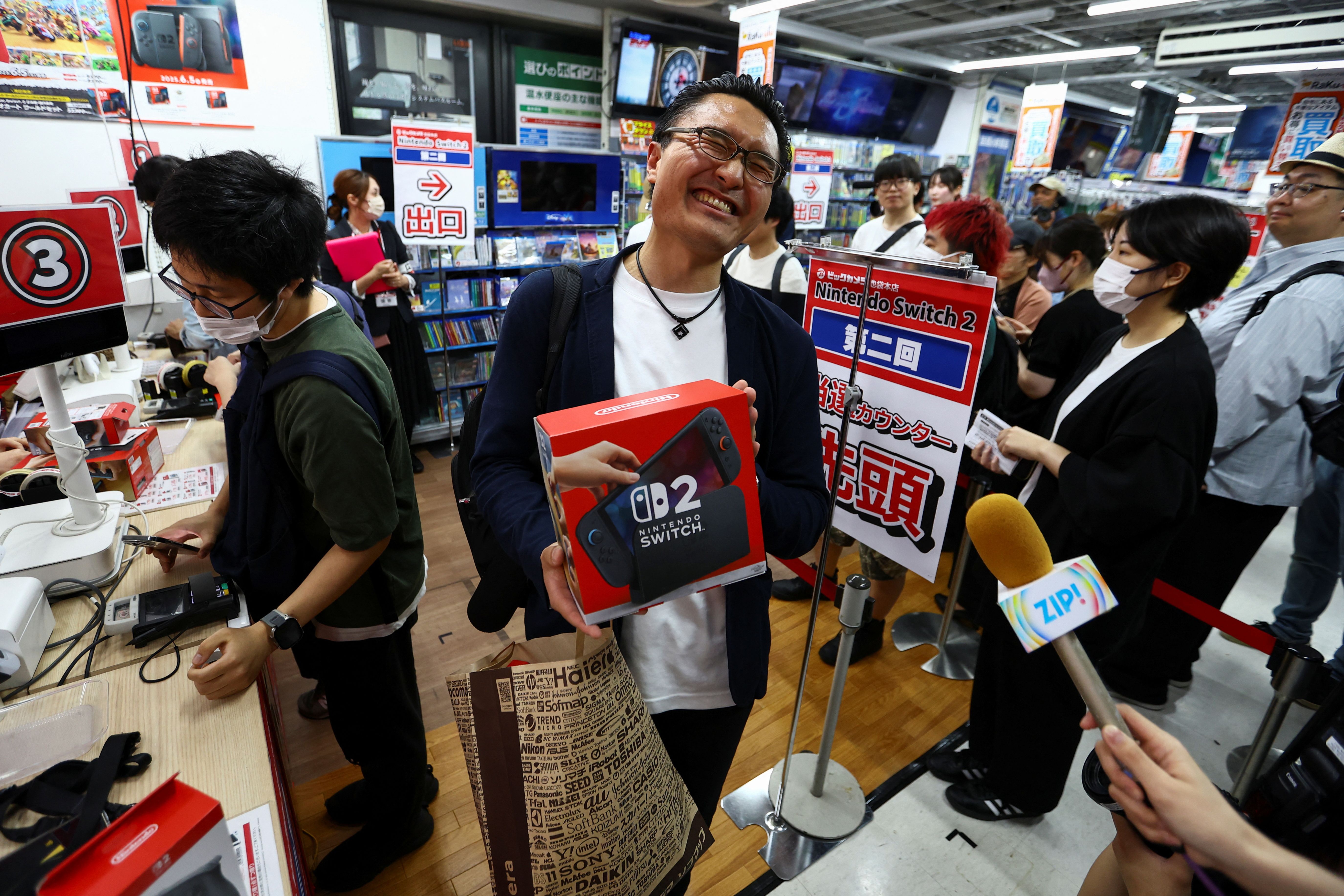 A customers holds his Nintendo Switch 2 game consoles as Nintendo starts selling the new consoles globally, at an electronics store in Tokyo, Japan on June 5, 2025. (Photo by Issei Kato/Reuters)