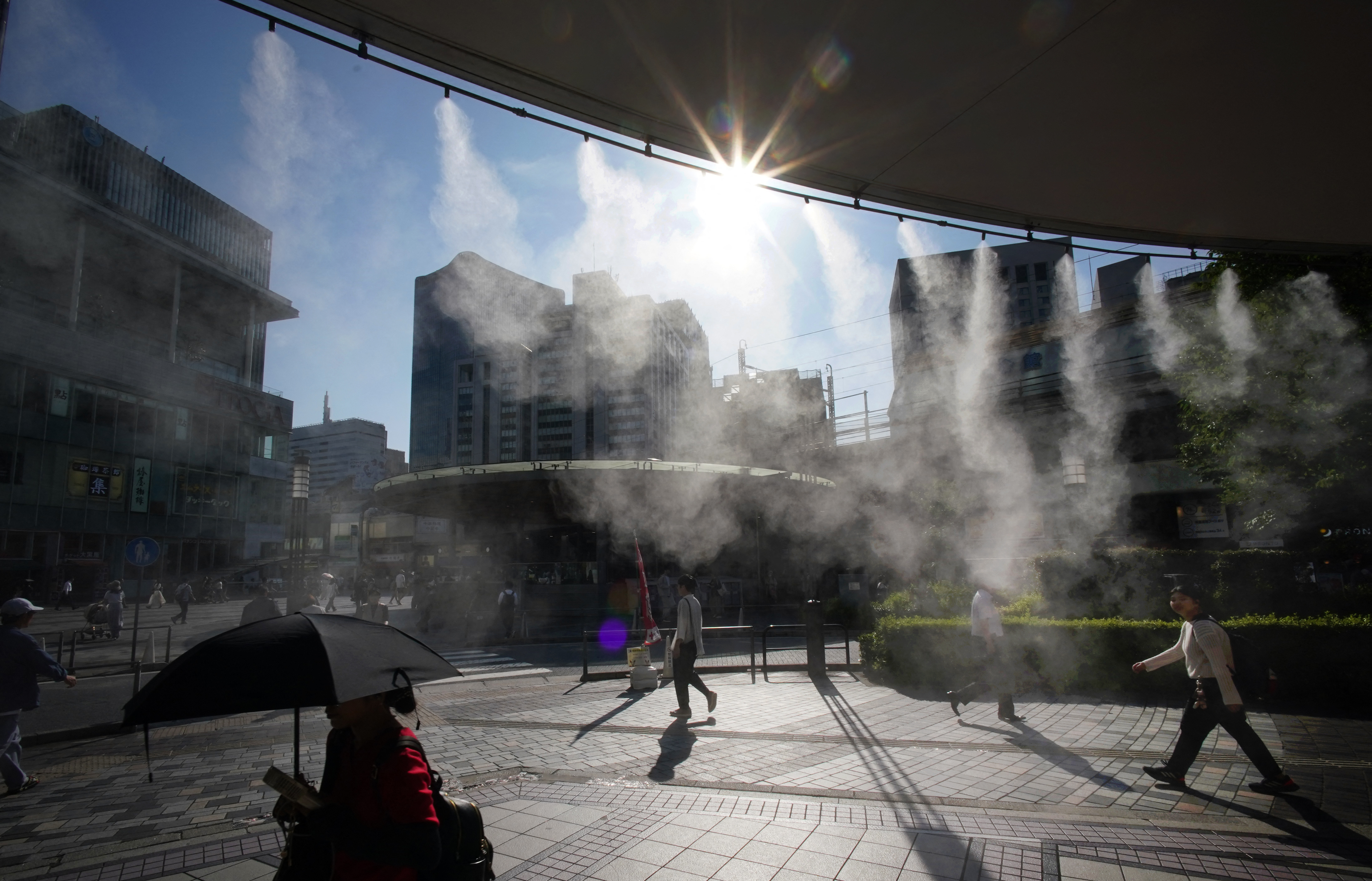 People walk through artificial mist to cool down on a hot day in Tokyo on June 19, 2025. (Photo by Kazuhiro Nogi/AFP Photo)
