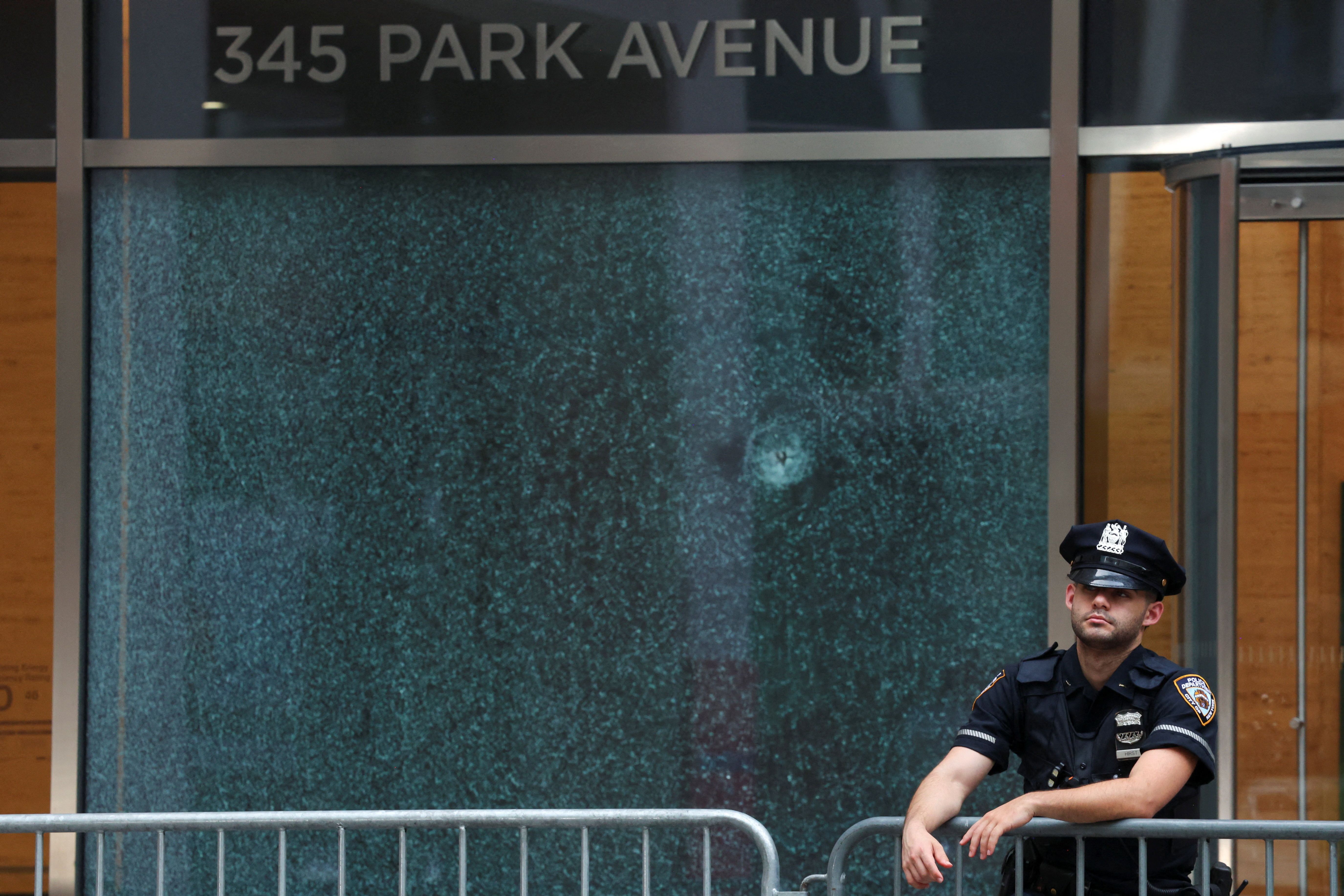 A police officer stands next to the glass window with a bullet hole near the scene of a deadly mass shooting in Manhattan, New York City, on July 29, 2025. (Photo by Mike Segar/Reuters)