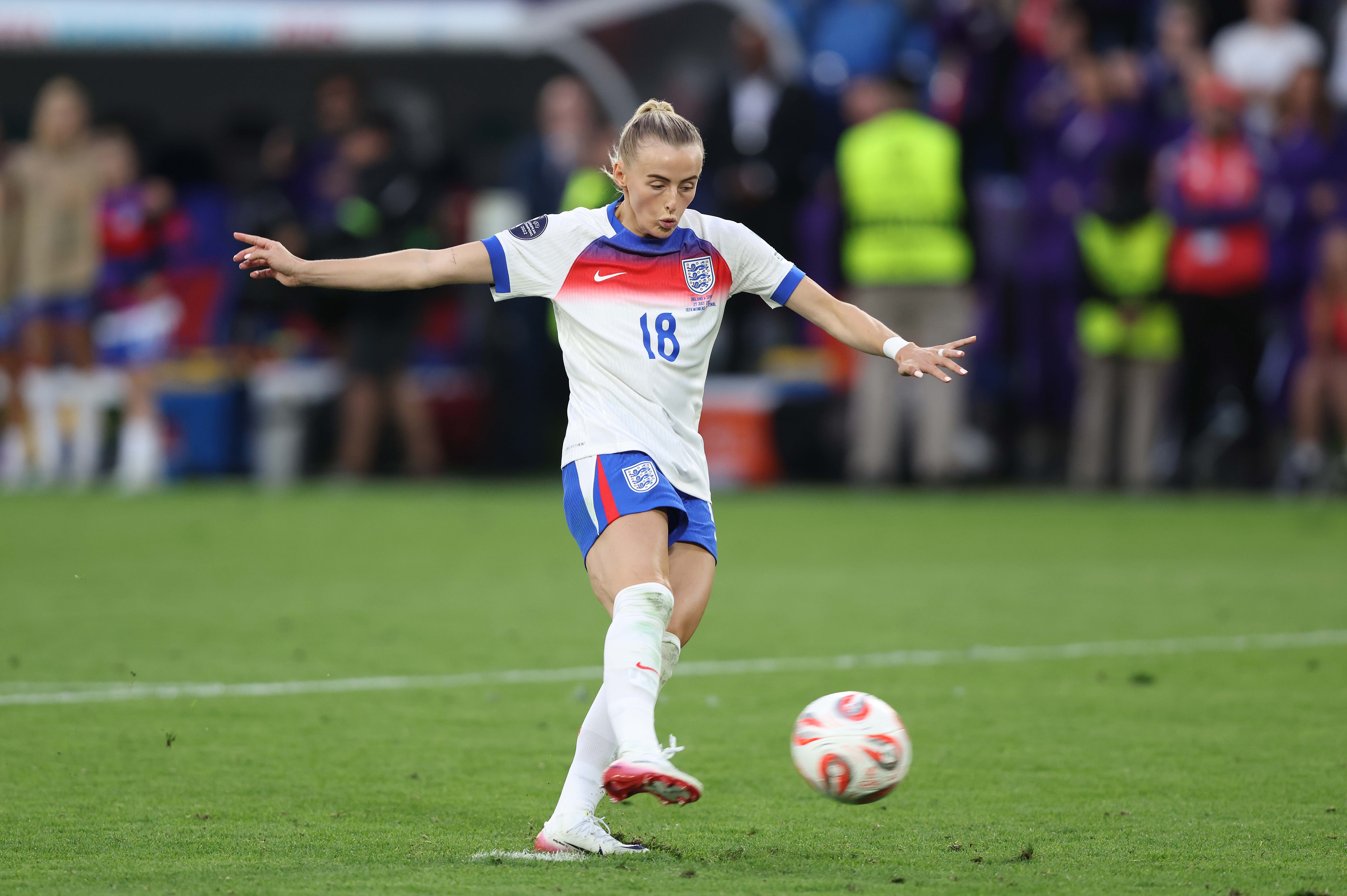 Chloe Kelly of England scores the winning penalty kick in the penalty shoot out to win the UEFA Women's EURO 2025 Final during the UEFA Women's EURO 2025 Final match between England and Spain at St. Jakob-Park on July 27, 2025 in Basel, Switzerland. (Photo by Crystal Pix/MB Media/Getty Images)