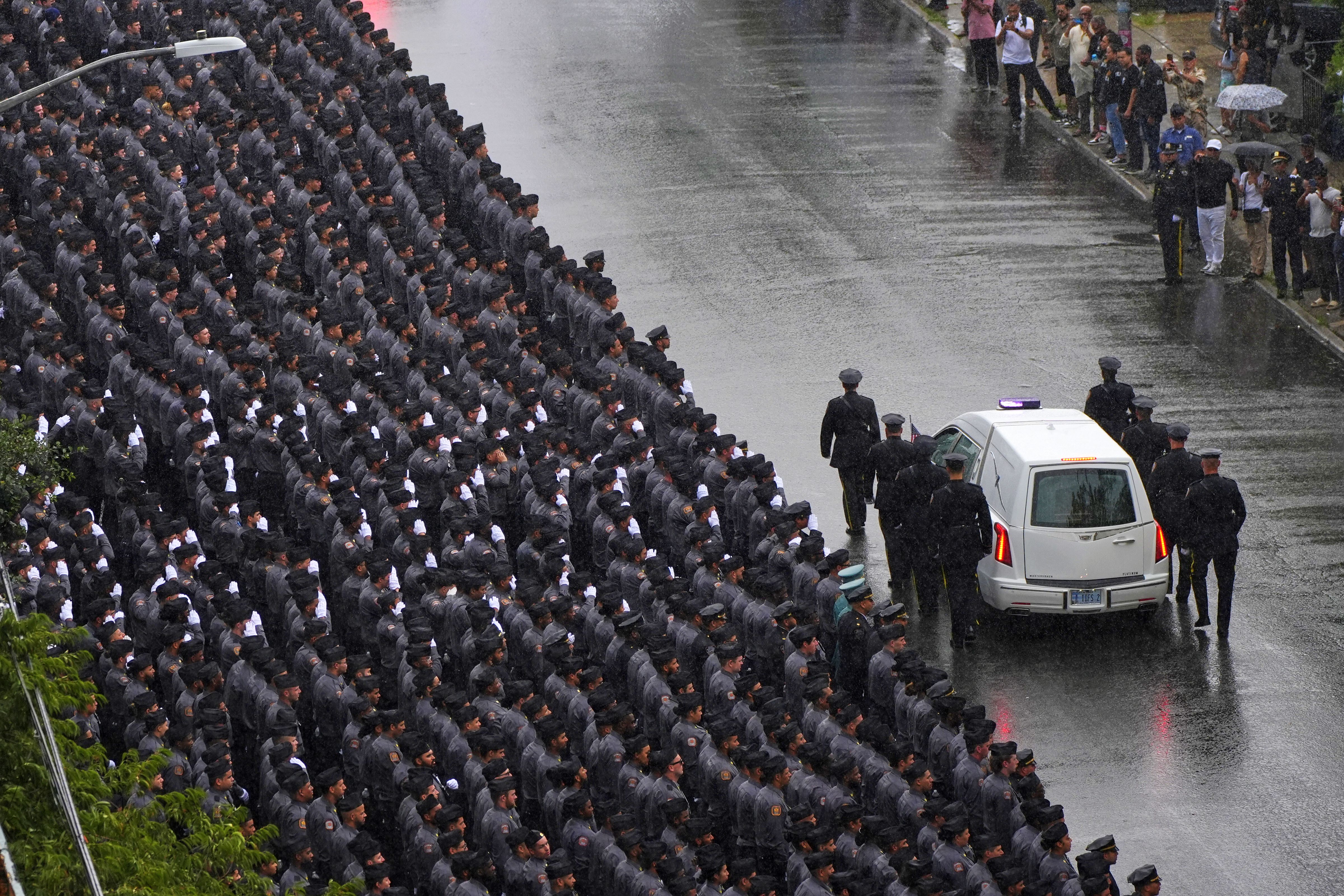 New York Police officers salute as the hearse carrying the casket of NYPD officer Didarul Islam passes after his funeral, Thursday, July 31, 2025, in New York. (Photo by Yuki Iwamura/AP Photo)