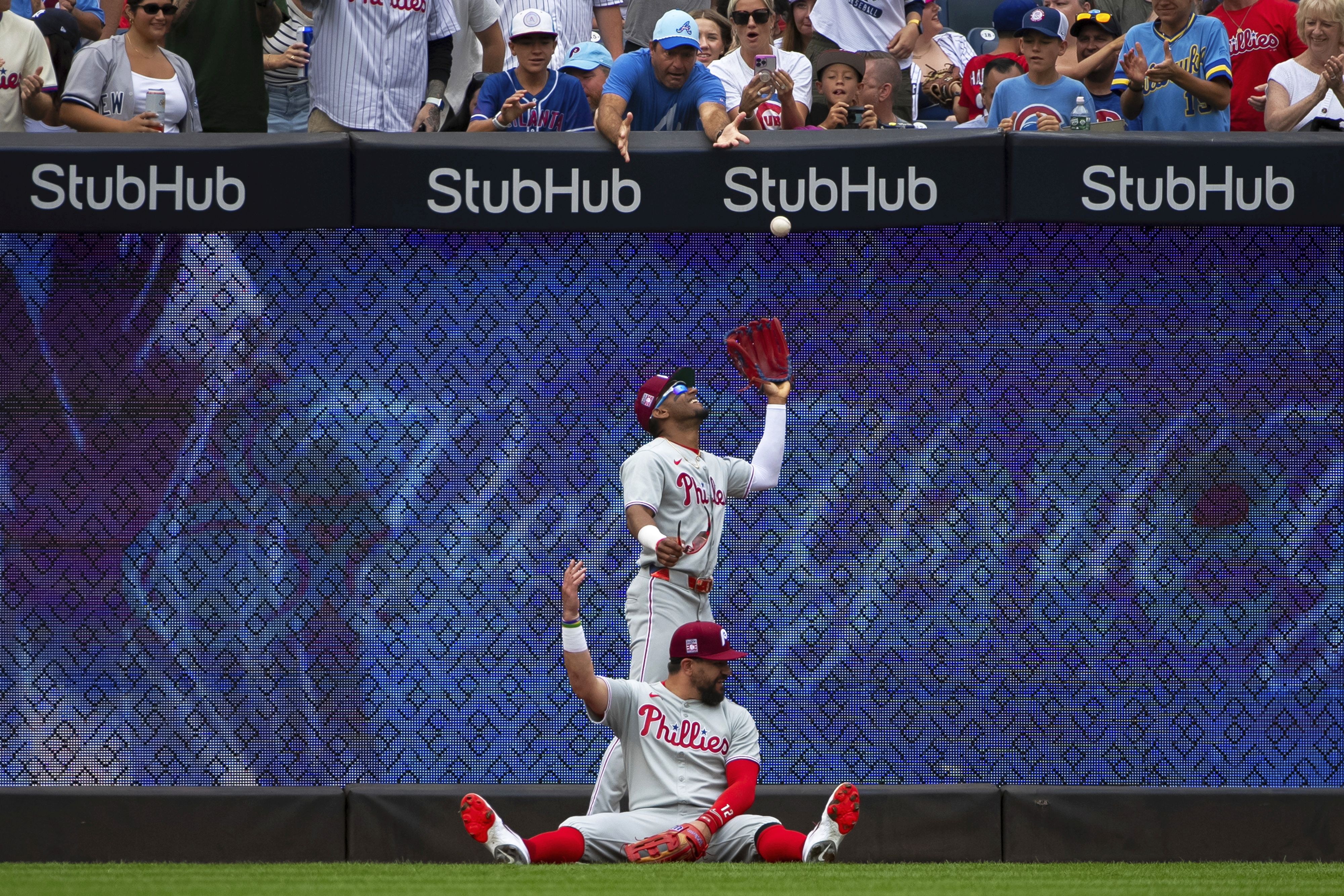 Philadelphia Phillies outfielder Kyle Schwarber (12) throws up his caught ball during the first inning of a baseball game against the New York Yankees, Sunday, July 27, 2025, in New York. (Photo by Angelina Katsanis/AP Photo)
