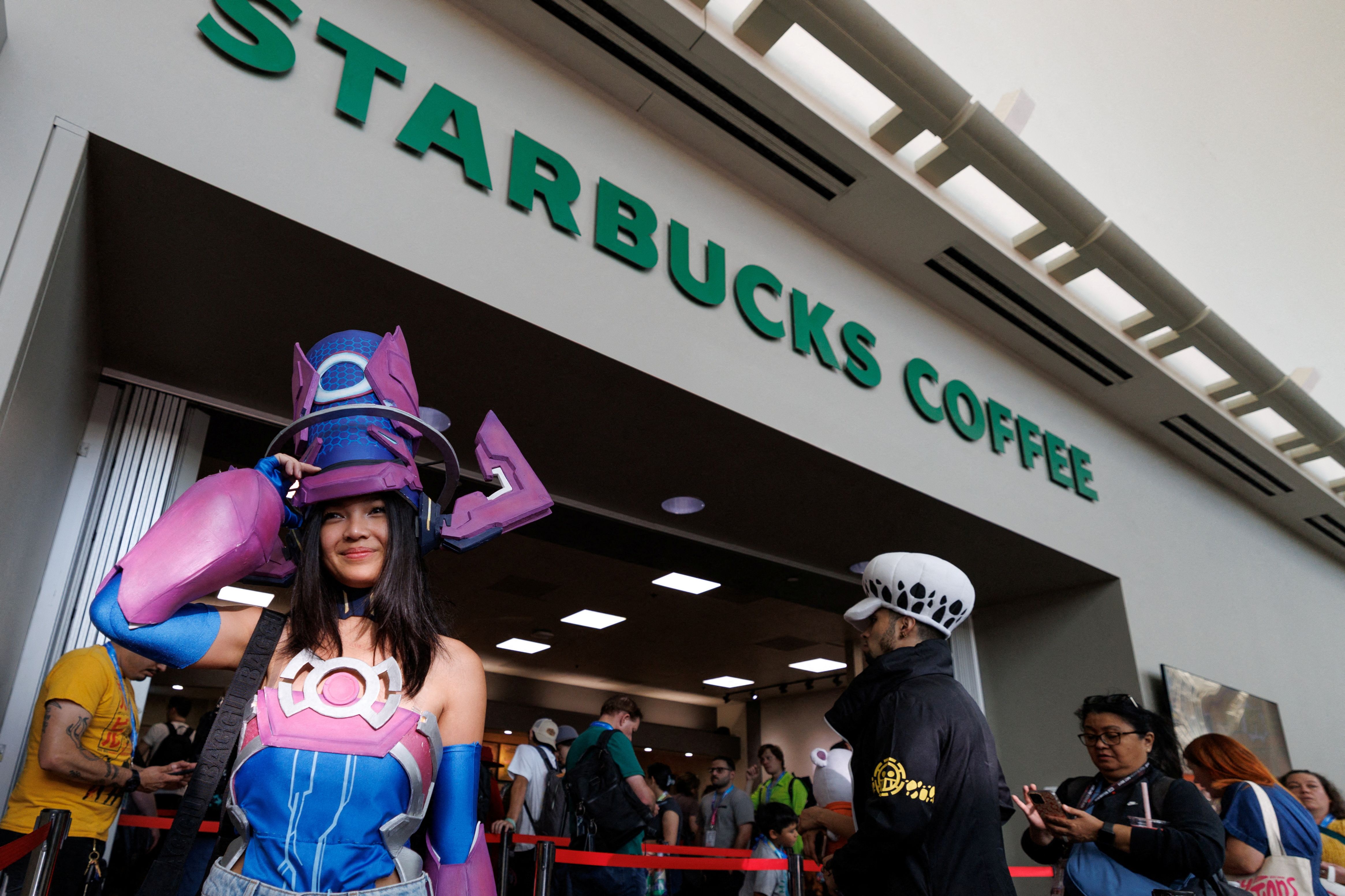A costumed attendee is shown as others wait in line to get a coffee during the opening day of Comic-Con International in San Diego, California, on July 24, 2025. (Photo by Mike Blake/Reuters)