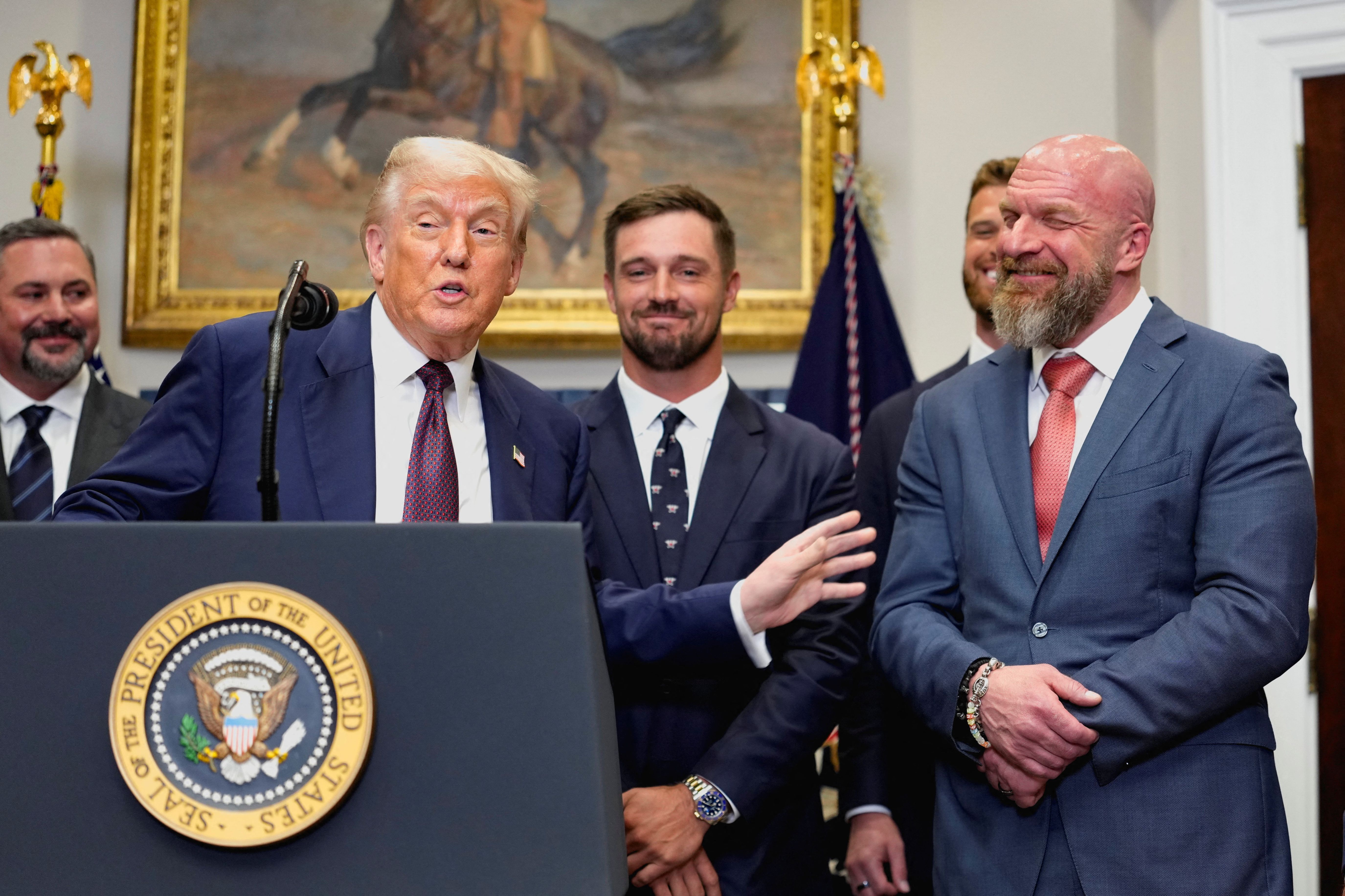 U.S. President Donald Trump and WWE Chief Content Officer Paul Michael Levesque, also known professionally as Triple H, react as Trump delivers remarks at the White House in Washington, D.C., U.S., July 31, 2025. (Photo by Kent Nishimura/Reuters)