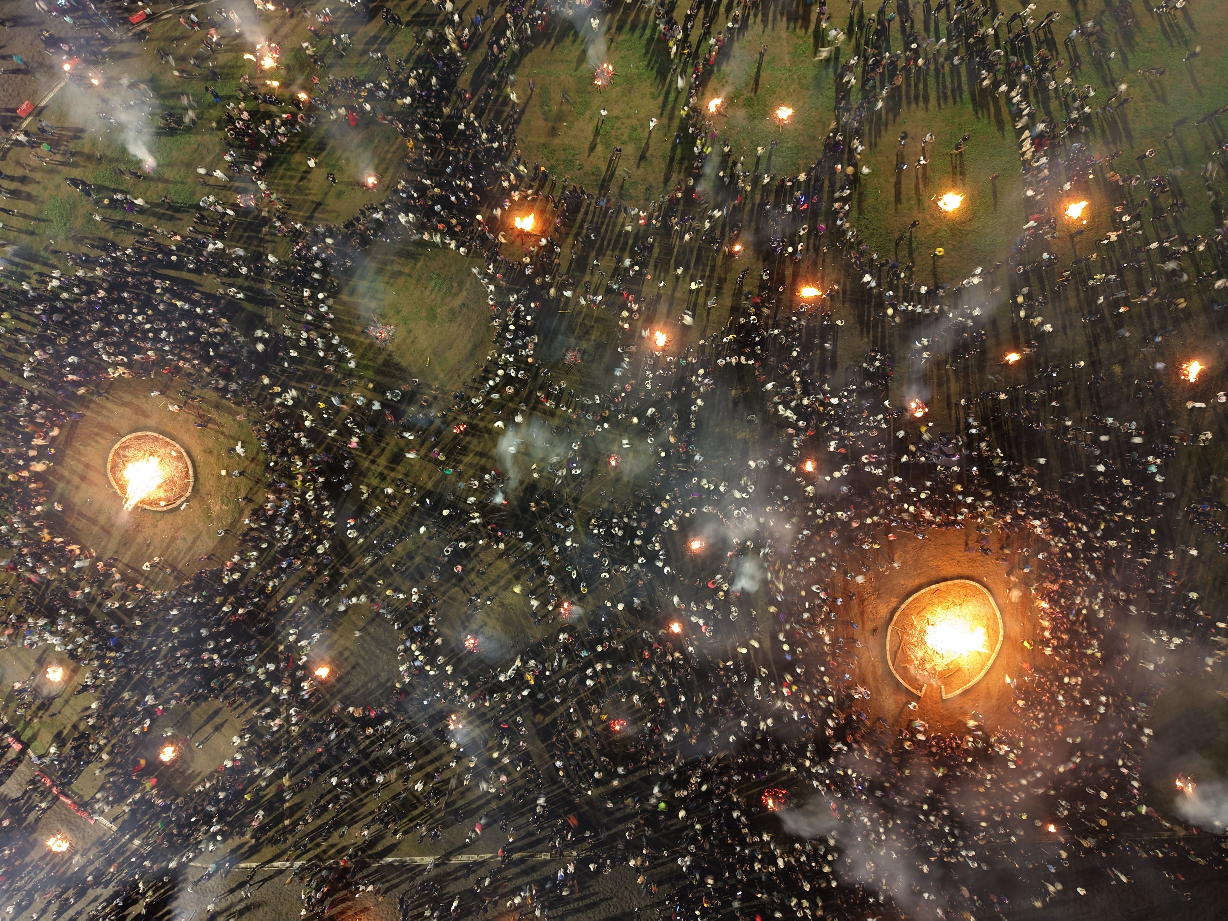 Aerial view of people circling around a bonfire to celebrate the Torch Festival on July 22, 2025 in Butuo County, Liangshan Yi Autonomous Prefecture, Sichuan Province of China. The Torch Festival is the biggest festival of people from the Yi ethnic group. (Photo by Luo Li/VCG via Getty Images)