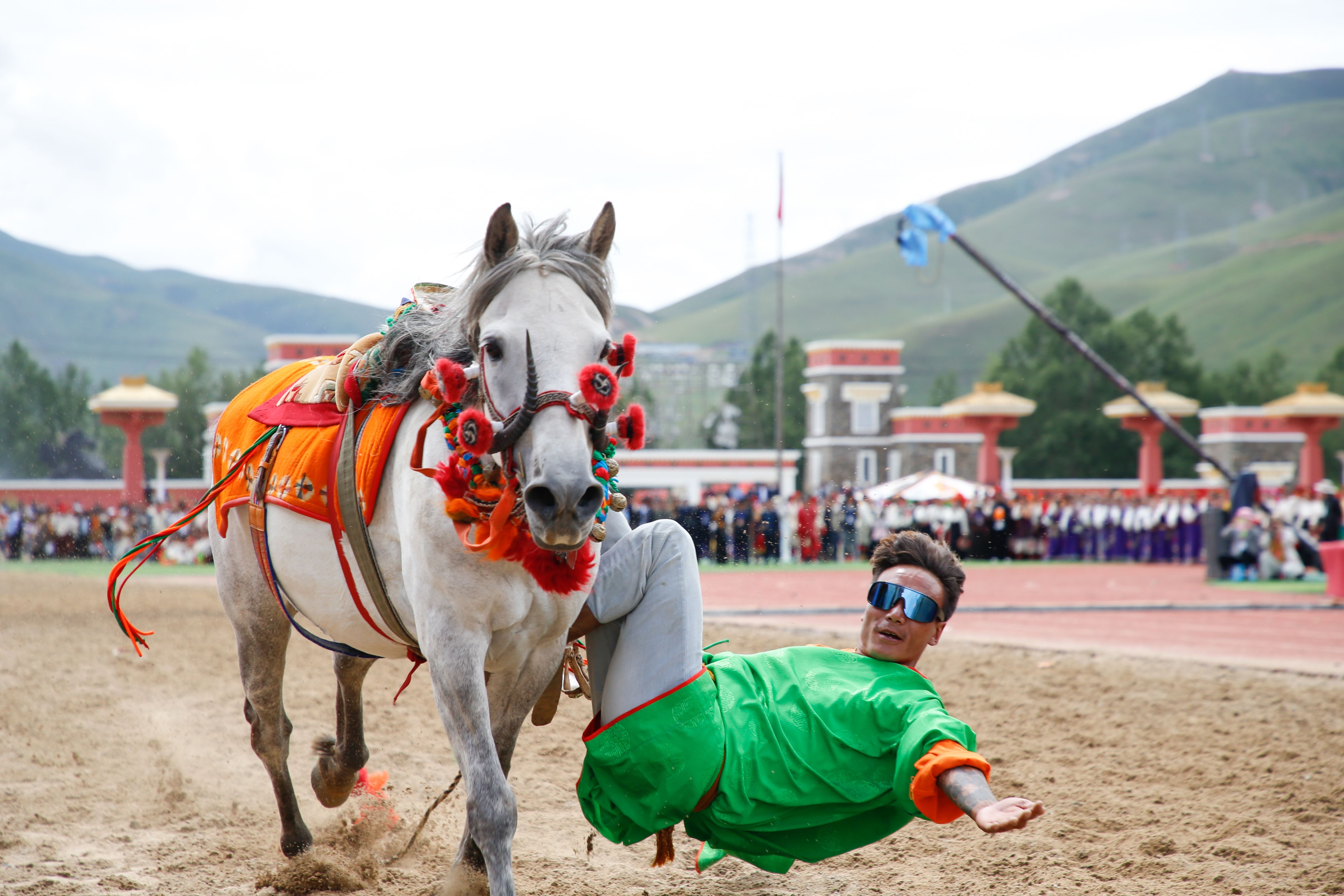 A rider in traditional Kangba costumes performs equestrian skills at the opening ceremony of the 2025 Yushu Horse Racing Festival and the 4th Sanjiangyuan Ecological Culture Tourism Festival on July 25, 2025 in Yushu City, Yushu Tibetan Autonomous Prefecture, Qinghai Province of China. Yushu Horse Racing Festival is one of the grandest festivals in Yushu Tibetan autonomous prefecture in Qinghai. (Photo by Ma Mingyan/China News Service/VCG via Getty Images)