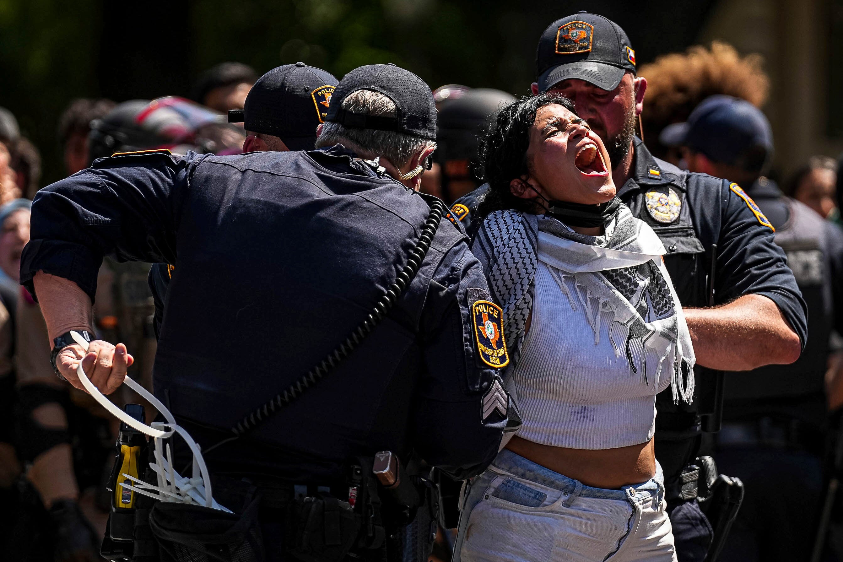 A pro-Palestinian protester yells “Free Palestine” as she is handcuffed by University of Texas at Austin police on the campus Monday, April 29, 2024, in Austin, Texas. (Photo by Aaron E. Martinez/Austin American-Statesman via AP Photo)
