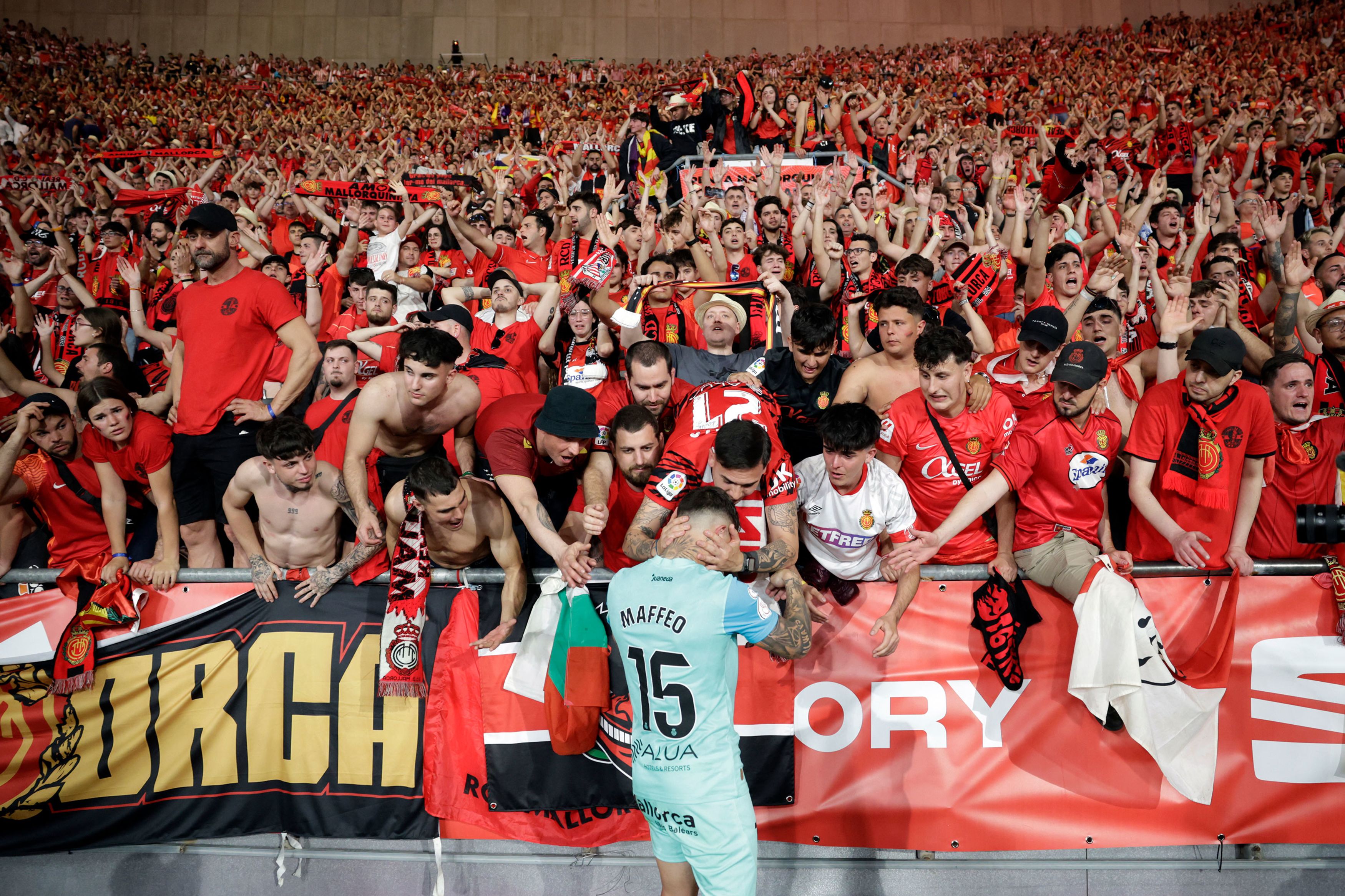 Mallorca fans confort Real Mallorca's Spanish defender #15 Pablo Maffeo at the end of the Spanish Copa del Rey (King's Cup) final football match between Athletic Club Bilbao and RCD Mallorca at La Cartuja stadium in Seville on April 6, 2024. (Photo by Jaime Reina/AFP Photo)