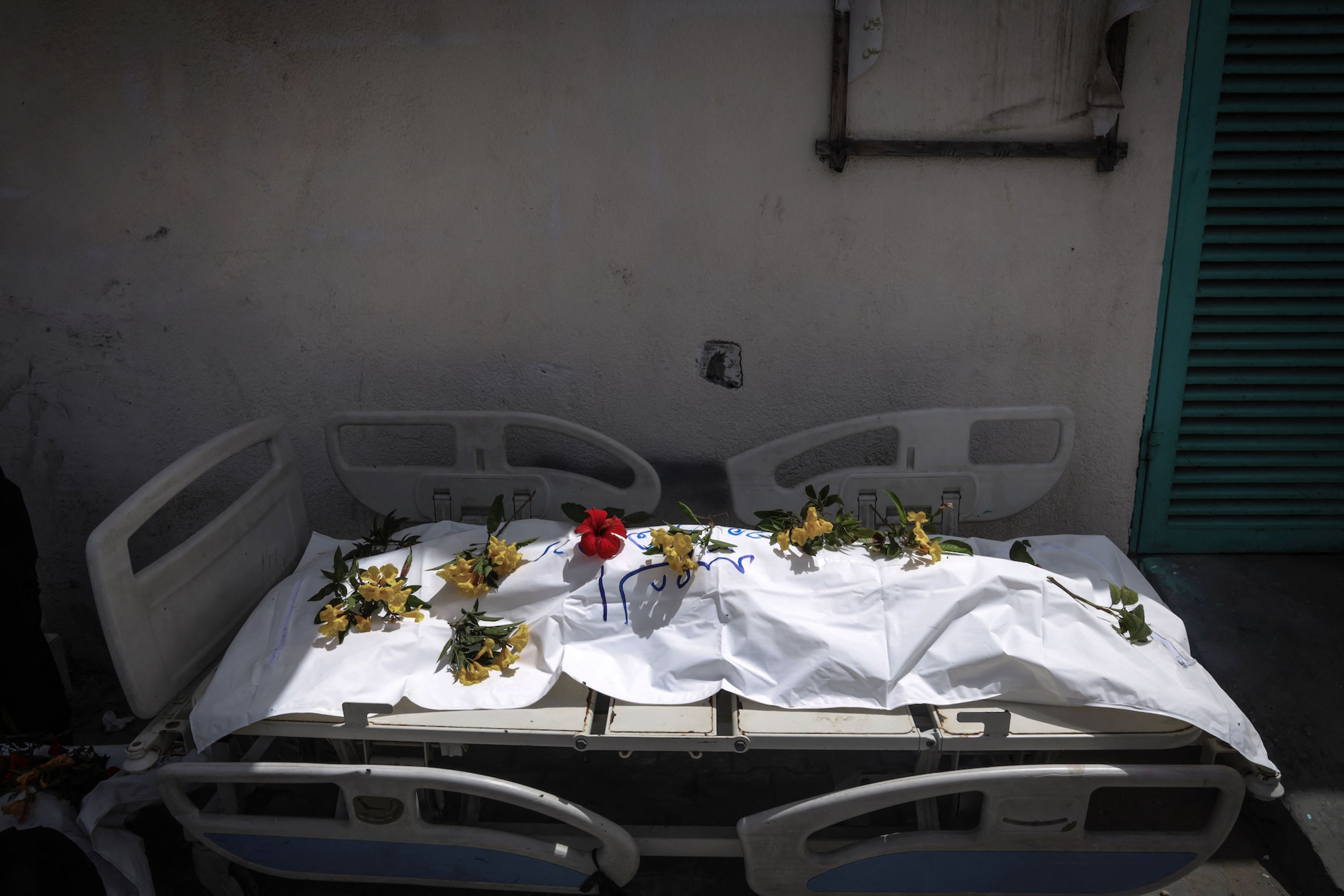 A body unearthed at Nasser Hospital is set on a stretcher and covered with flowers before being buried in Khan Younis, Gaza, on Tuesday, April 23, 2024. Nearly 400 bodies have been found in mass graves at the hospital following Israeli troops' withdrawal from the area earlier this month, the Palestinian Civil Defense in Gaza said on Thursday. The Israel Defense Forces has said any suggestion that it buried Palestinian bodies in mass graves was false, and that a grave at the Nasser complex was dug by Palestinians in Gaza some months ago. (Photo by AFP Photo/Stringer)