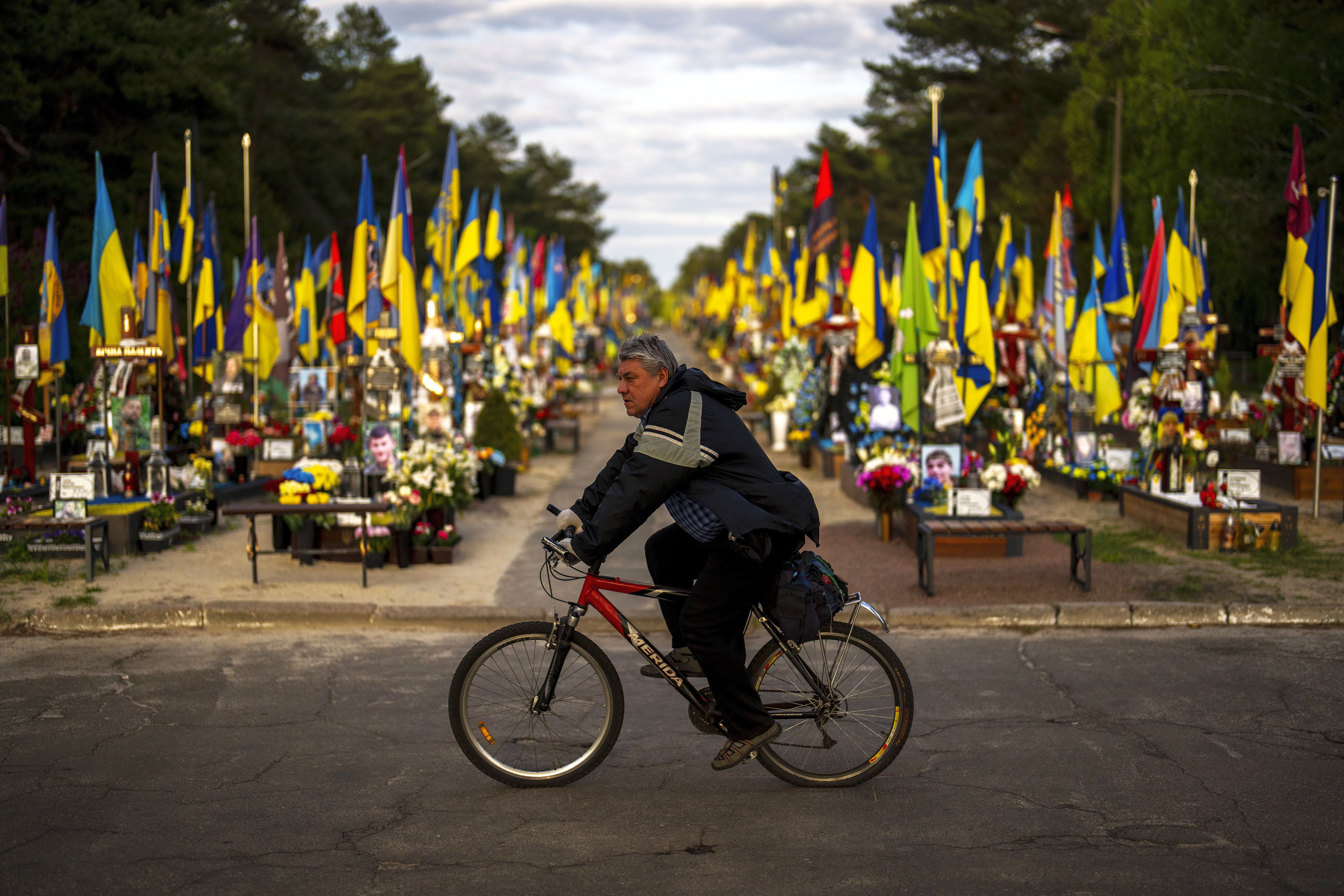 A man rides a bicycle past the tombs of Ukrainian soldiers killed during the war, at Lisove cemetery in Kyiv, Ukraine, Tuesday, April 23, 2024. (Photo by Francisco Seco/AP Photo)